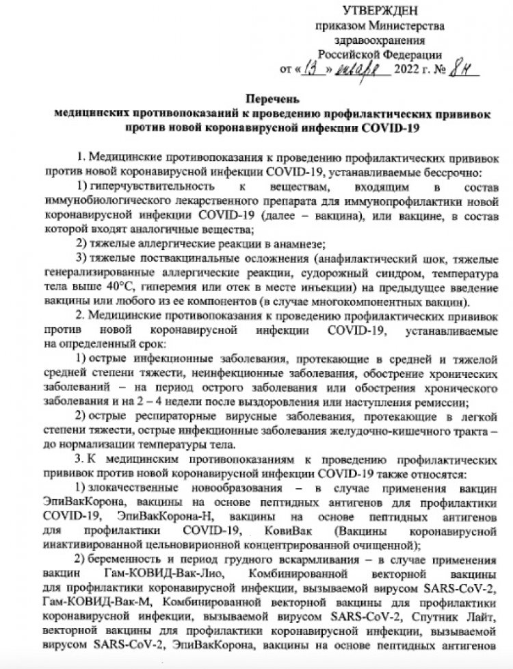 Минздрав опубликовал обновленный перечень медицинских противопоказаний к проведению профилактических прививок против новой коронавирусной инфекции COVID-19.