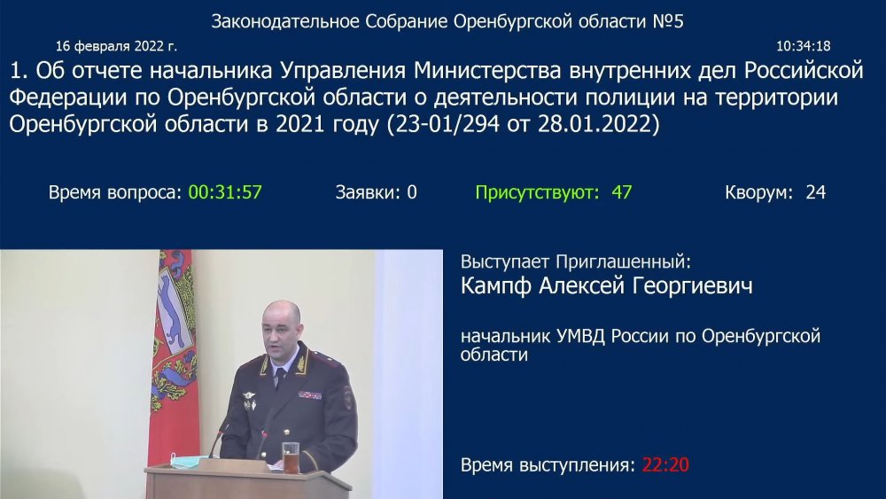 Начальник УМВД России по Оренбургской области Алексей Кампф отчитался по итогам работы в 2021 году. В своем выступлении на заседании Заксоба он прокомментировал наиболее резонансные события.
