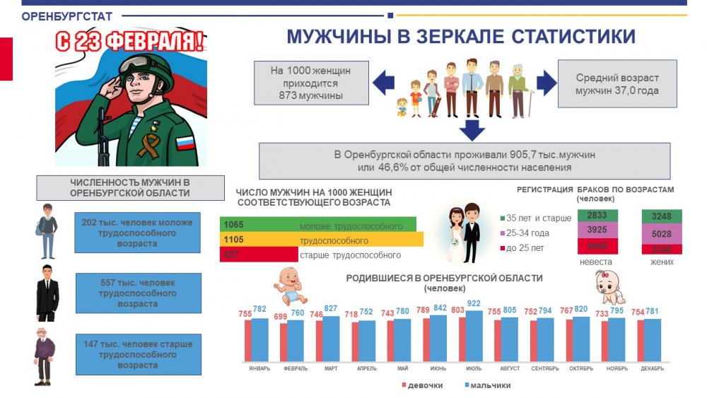 Интересно и то, что в Оренбуржье в среднем мальчики рождаются чаще, однако к 35 годам жизни численность женщин начинает превалировать. Так, в начале прошлого года доля мужчин в возрасте от 70 лет и старше было всего лишь 29,8%. Средний возраст представителей сильной половины человечества - 37 лет, а женщин – 42,3 года.