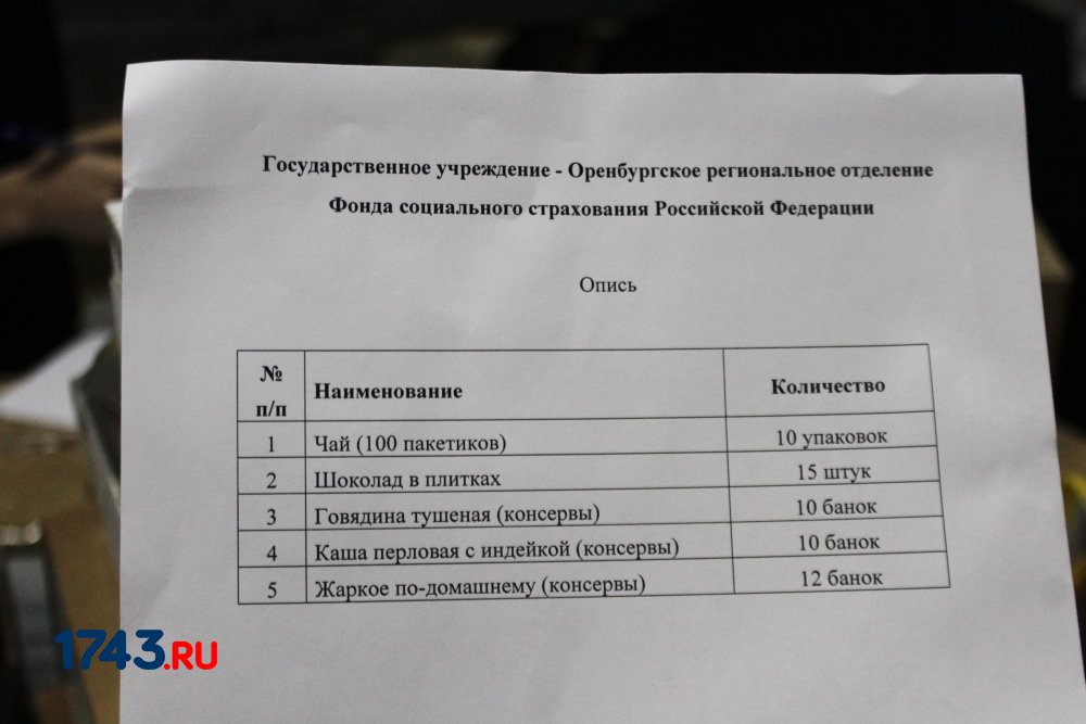 Среди участников акции — школа №76 Оренбурга. В описи собранного можно увидеть 19 антисептиков, 24 вермишели быстрого приготовления, 20 упаковок конфет, 100 пачек мыла, 121 пачка печенья, 6 маек, 62 плитки шоколада, 40 упаковок горохового супа и т.д.