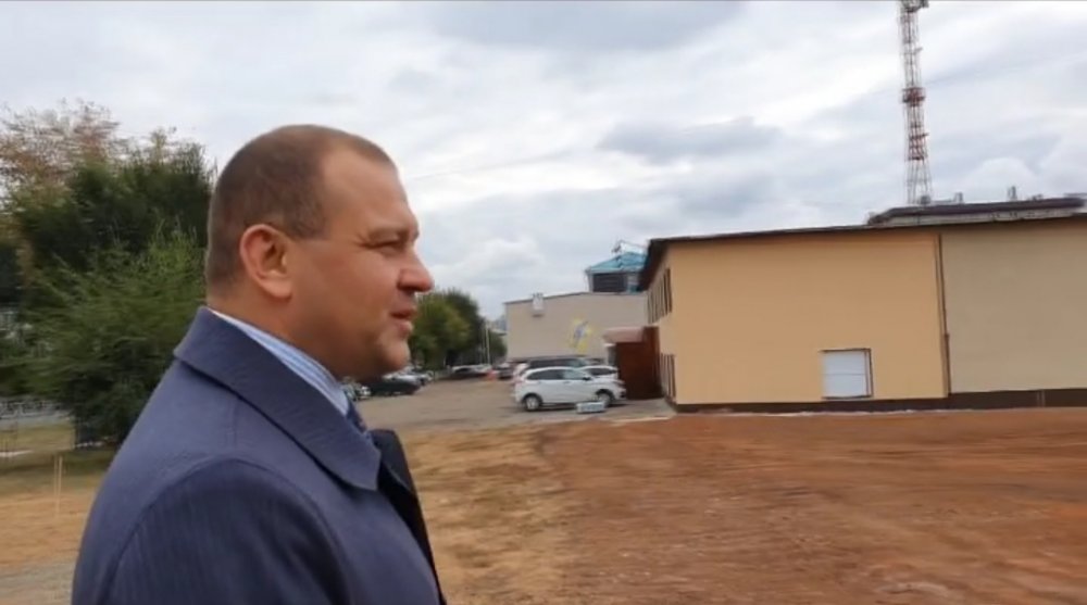 Глава Оренбурга Сергей Салмин проверил, как идут работы по строительству хоккейной площадки рядом со спортшколой Ковалевского на перекрёстке Знаменском и 60 лет Октября.