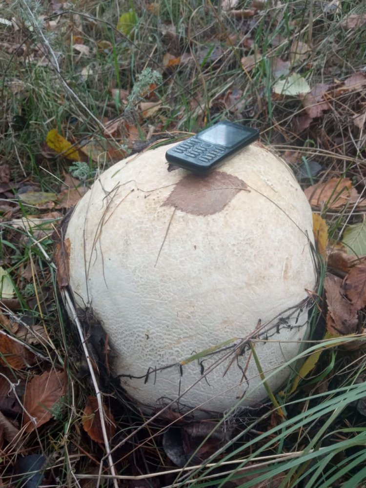 В Бузулукском бору вырос гигантский гриб-дождевик. По фото можно понять его параметры, сравнив с размером мобильного телефона.