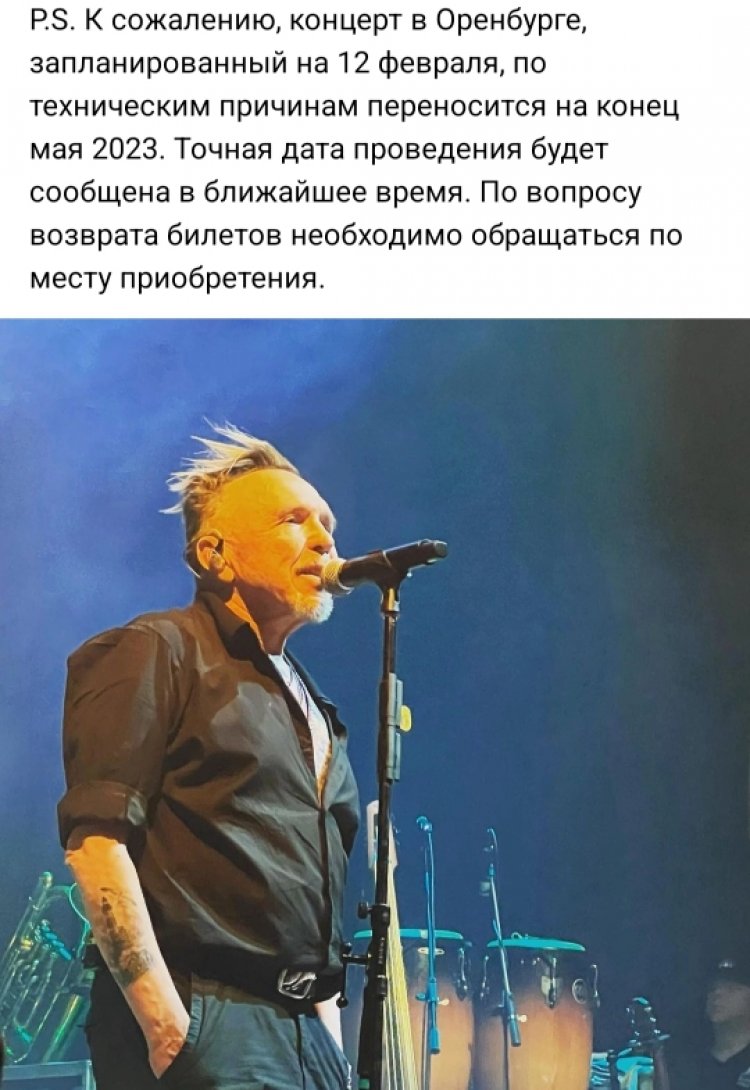 В Оренбурге отменили концерт Гарика Сукачёва. Концерт должен был состояться завтра, 12 февраля, в СКК «Оренбуржье». Организаторы сообщают, что отмена связана с технической причиной. Какой именно не уточняется. По предварительным данным, мероприятие переносится на конец мая. Точная дата проведения будет сообщена в ближайшее время, пояснили представители музыканта. Билеты остаются действительными. По вопросу их возврата необходимо обращаться по месту приобретения.