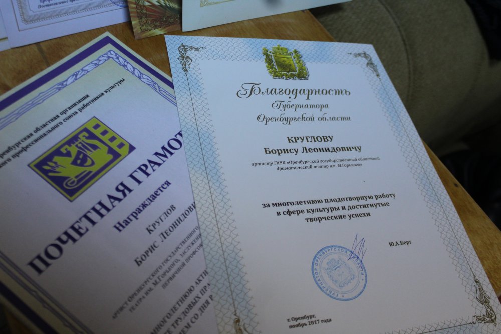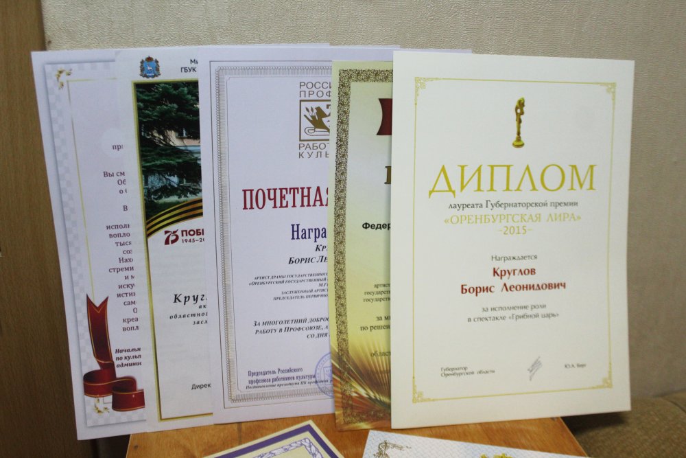 На полках в гримерке Заслуженного артиста России Бориса Круглова можно заметить множество наград, в том числе несколько губернаторских премий «Оренбургская лира» за лучшую актерскую работу. В сфере искусства её называют местным «Оскаром». Но наш герой признался, что все эти грамоты меркнут по сравнению с главной наградой – зрительскими аплодисментами.