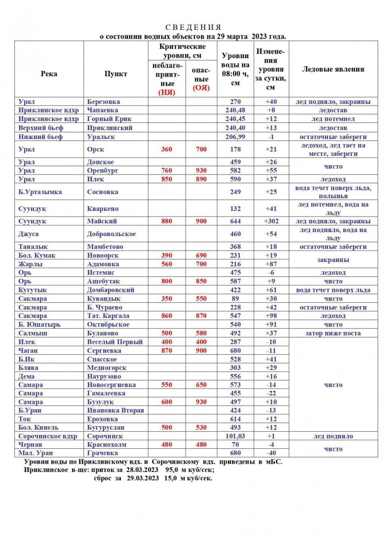 Больше всего вода понялась в реке Суундук возле села Майский Кваркенского района — на 302 см, сейчас показатель составляет 644 см. До опасной отметки остается 256 см. Отличилась и р. Сакмара, набрав у Татарской Каргалы за сутки 98 см — до 547 см. Приток в Ириклу составляет 95 м куб/сек, сброс — 15 м. куб/сек.