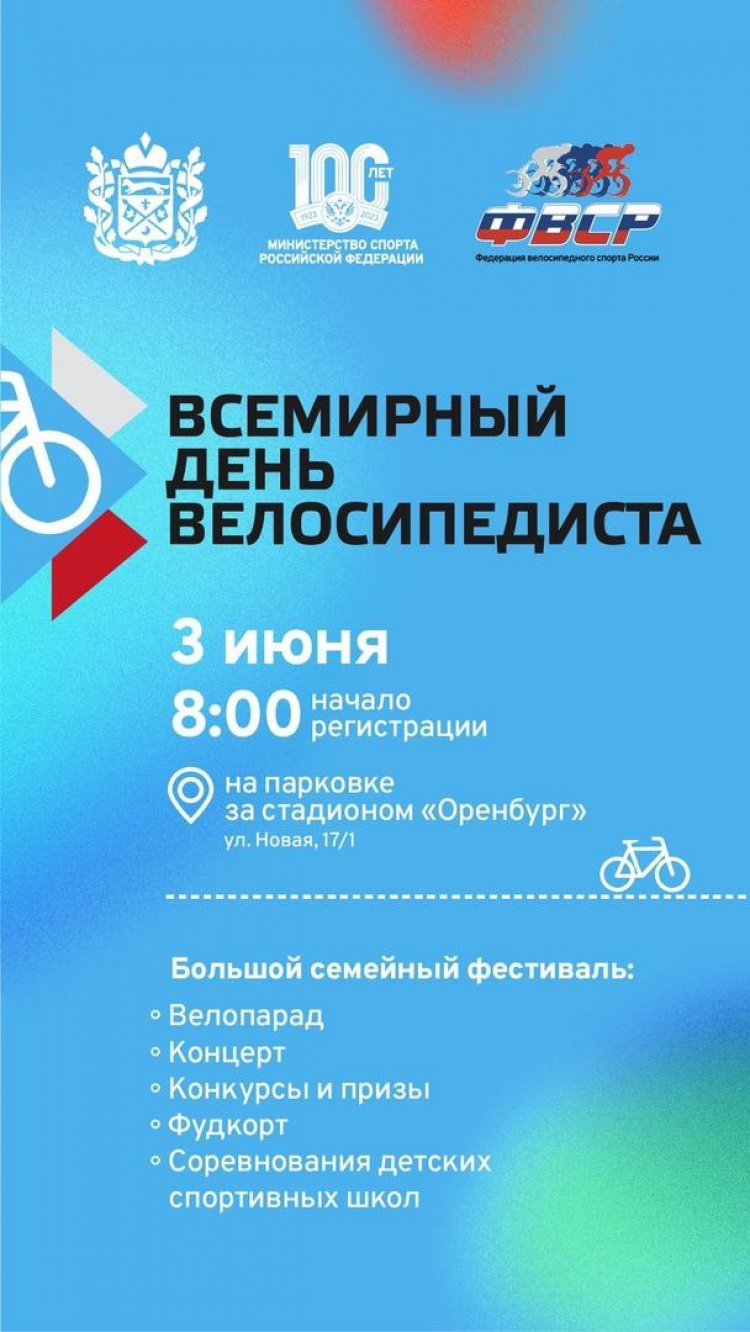 3 июня в Оренбурге пройдёт Всероссийская массовая велосипедная гонка, посвященная Всемирному дню велосипедиста (0+). Участникам в зависимости от возраста предстоит преодолеть дистанцию от 200 м до 7 км. Старт запланирован у стадиона «Оренбург» (ул. Новая, 17/1). Велоколонна проедет по ул. Терешковой, затем свернет в районе ул. Оренбургской и финиширует на ул. Прохоренко. Участников и зрителей велопробега ждёт большая праздничная программа – велопарад, концерт и различные конкурсы.