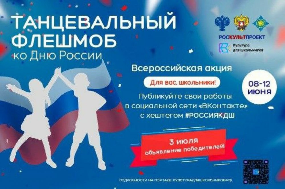 С 8 по 12 июня в рамках межведомственного культурно-образовательного проекта «Культура для школьников» пройдет Всероссийская акция «Танцевальный флешмоб ко Дню России». В творческом мероприятии может принять участие каждый школьник. Для этого необходимо записать на видео свой танец под песню Сергея Паради «Моя Россия, моя страна», сделать пост и опубликовать его на своей странице или странице родителя, педагога, учреждения в социальной сети «ВКонтакте» с хештегом #Россиякдш, указав регион, имя и фамилию, название коллектива или учреждения.