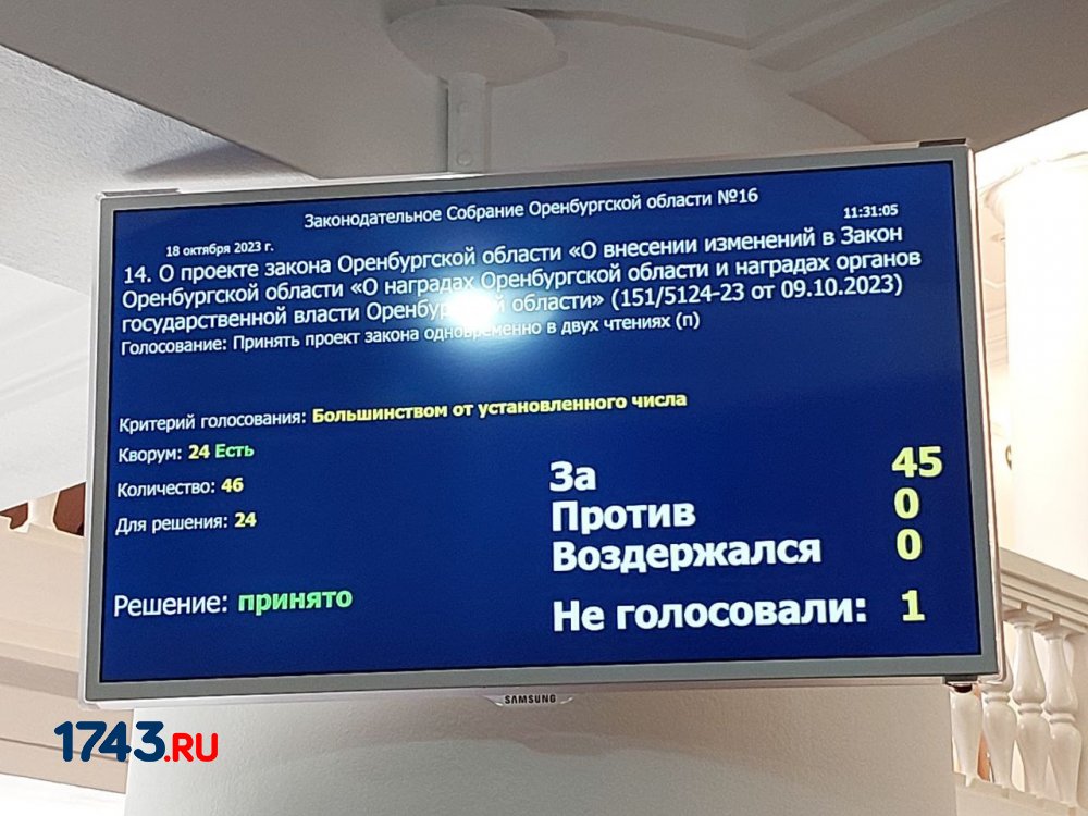 На заседании также рассмотрели вопрос об учреждении в Оренбуржье знака отличия «За содействие специальной военной операции». Награду будут вручать тем, кто внёс значительный вклад в осуществление мероприятий, связанных с СВО на территории Украины и новых российских регионах. Депутат Романенко отметил, что к аналогичной медали в Приморье награждаемые получают 30 тысяч рублей. Депутаты поддержали закон единогласно.