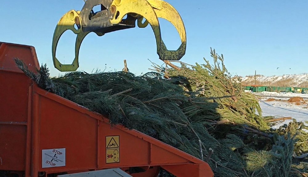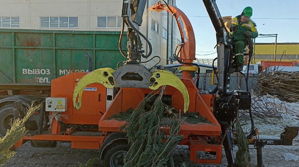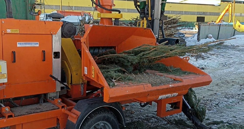В итоге все остатки живых елок измельчат с помощью дробильной машины. Часть полученной щепы пойдет на отсыпку полигона. А остальное отправят в организации по содержанию животных, где её используют как подкормку и подстилку.
