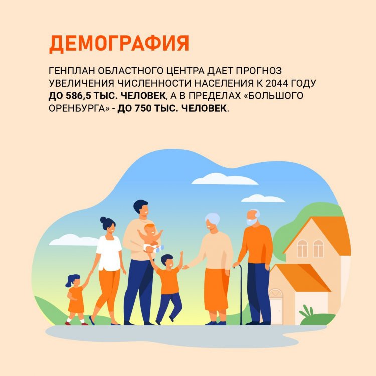 - увеличение численности населения к 2044 году до 586,5 тысяч человек, в пределах Большого Оренбурга (Оренбург и Оренбургский район) до 750 тысяч человек;
