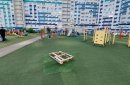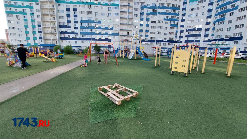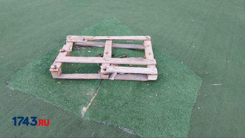 Нельзя не упомянуть и состояние детской площадки, посередине которой кто-то положил деревянный поддон. Судя по металлическим элементам под ним, ранее на этом месте был МАФ. Вероятно, его срезали, но не смогли ничего придумать с торчащими из-под покрытия деталями крепления и просто прикрыли их таким образом.