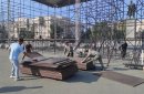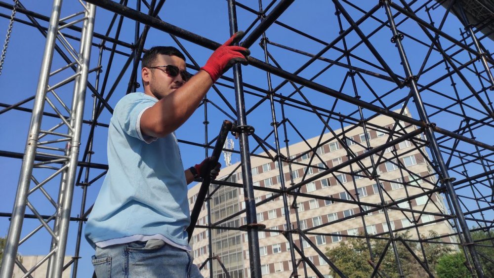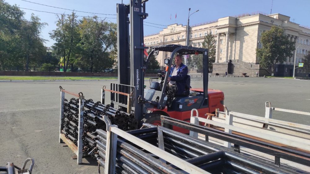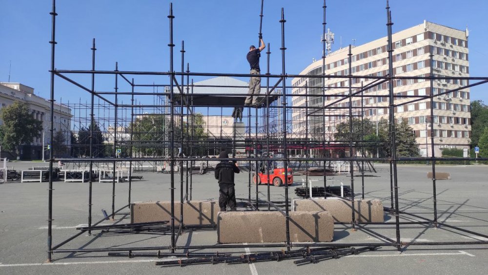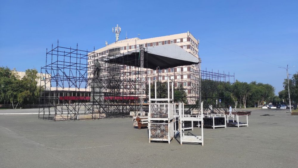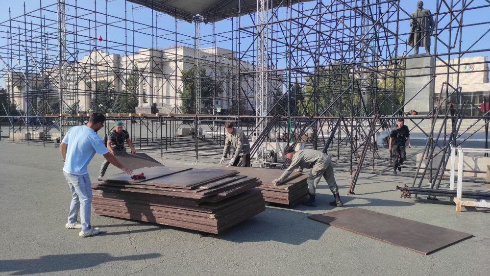 Отметим, что на площади им. Ленина продолжается подготовка к празднику. Возводится сцена и устанавливаются трибуны.