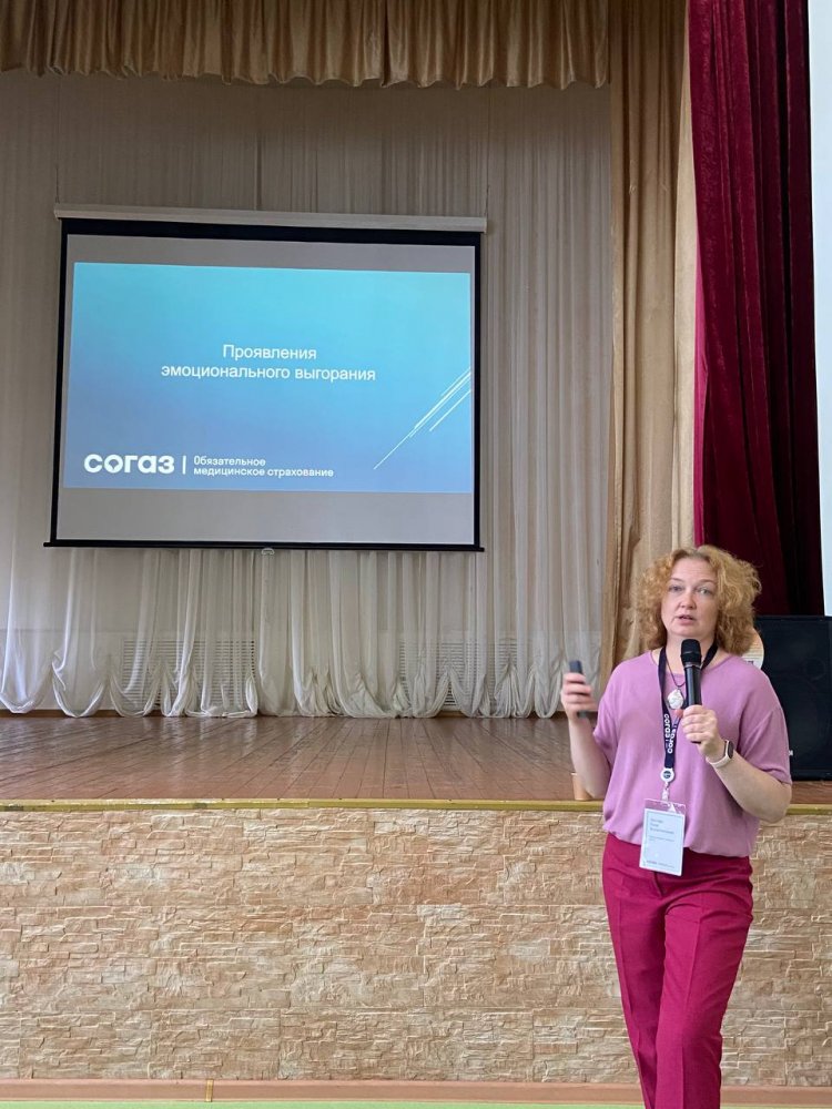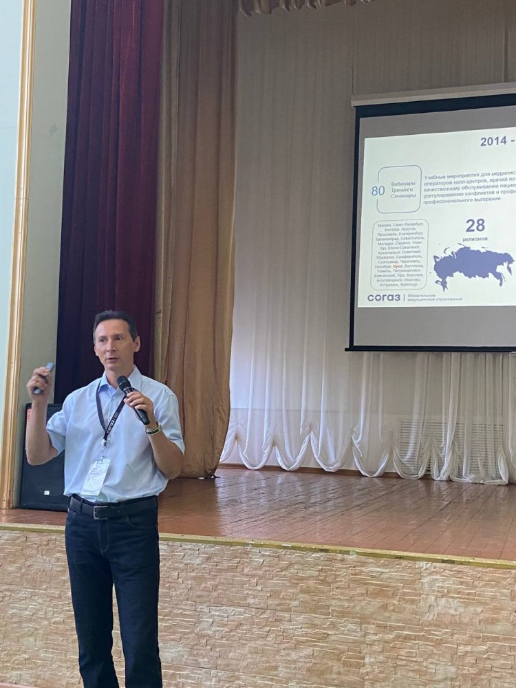 Руководитель учебного центра страховой компании Юрий Паршин рассказал аудитории, как вести диалог пациентом, какие фразы стоит использовать в общении. О методах профилактики профессионального выгорания и быстрого эмоционального восстановления сообщила руководитель направления учебного центра Вера Шутова.