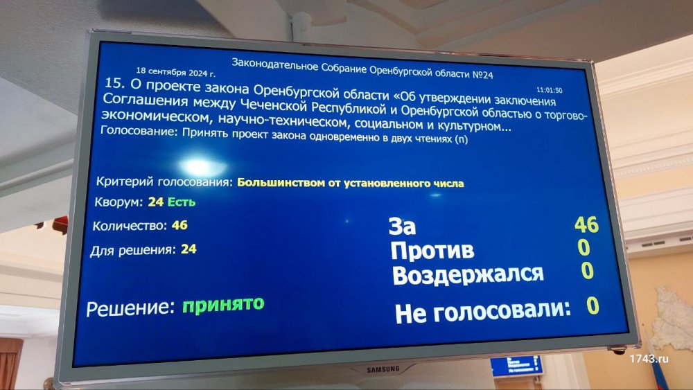 После все 46 депутатов поддержали подписание соглашения между Чеченской Республикой и Оренбургской областью о торгово-экономическом, научно-техническом, социальном и культурном сотрудничестве.