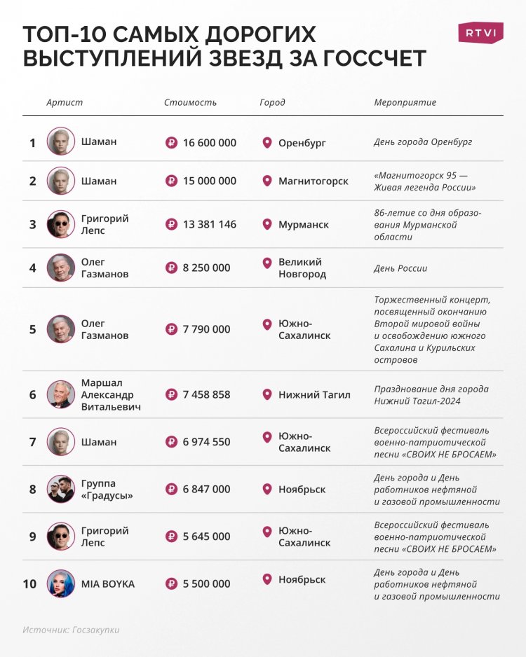 Отметим, что Ярослав Дронов (настоящее имя Шамана) дважды появился в рейтинге. Он также взял «серебро» за 15-миллионный концерт в Магнитогорске и расположился на седьмой строчке за выход на сцену в Южно-Сахалинске, где ему заплатили 6 794 550 рублей.