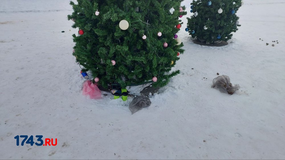 После наш взгляд упал на что-то разноцветное. «Подарки? Украшения?», - подумали мы. Но нас быстро настигло разочарование. Видимо, оренбуржцы себя плохо вели в этом году, что Дед Мороз привез им мусор. А если убрать шутки в сторону, то стаканчики и прочее под елками дело рук обычных нечистоплотных горожан.