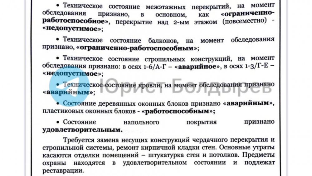 Жители дома №15 по ул. Чичерина продолжают бороться за будущее своего дома. Юрист Дмитрий Болдырев поделился результатами экспертизы, которая признала здание аварийным. Согласно документам, ограниченно-работоспособными признали фундамент, наружные стены, перегородки, межэтажные перекрытия, балконы и тд. При этом в аварийном или недопустимом состояниях находятся кровля, перекрытие над вторым этажом, деревянные оконные блоки, стропильные конструкции и тд. Эксперты, в целом, объект назвали соответствующим аварийной категории. Однако реставрацию дома назвали возможной при проведении работ по специально разработанному проекту.