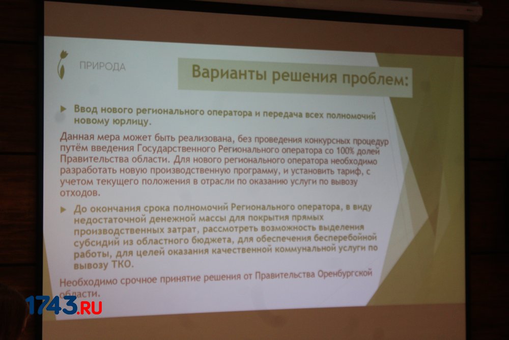 — Предлагаем рестарт мусорной реформы в Оренбуржье. Необходимо создать государственную компанию, которая примет на себя функции регоператора, закон это допускает без проведения процедуры торгов.