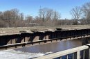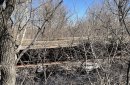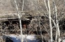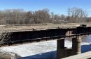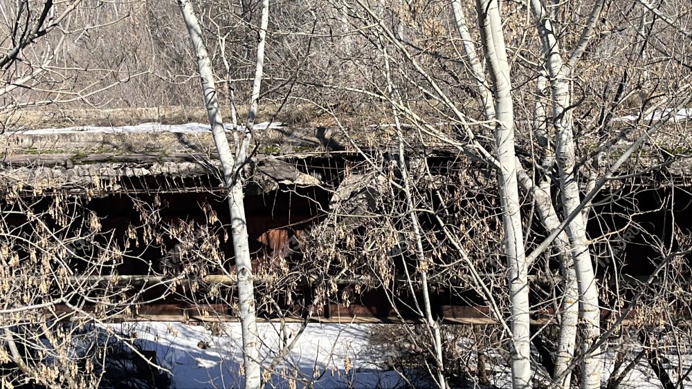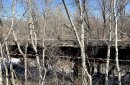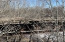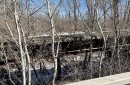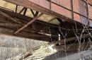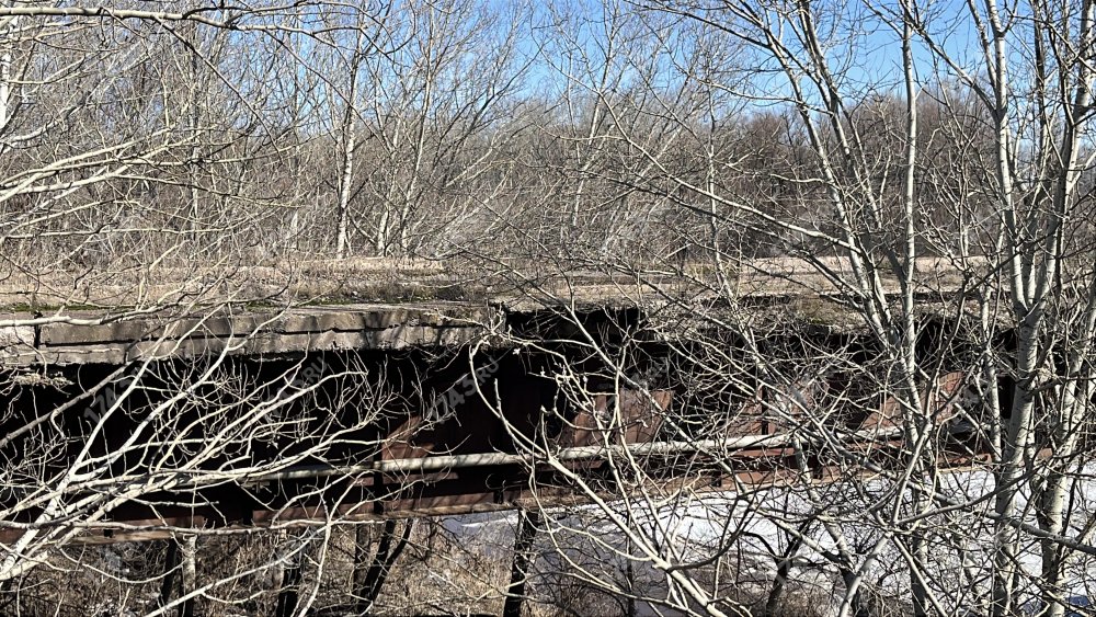 Первым объектом нашего внимания стал заброшенный мост. Смотреть на него, честно говоря, страшно: ржавчина, дыры, крошащийся бетон. Особую тревожность вызывают свисающие элементы железобетонной конструкции, которые держатся только на сгнившей арматуре и честном слове. Они выглядят так, будто могут рухнуть в любой момент на проплывающего под ними рыбака на лодке.
