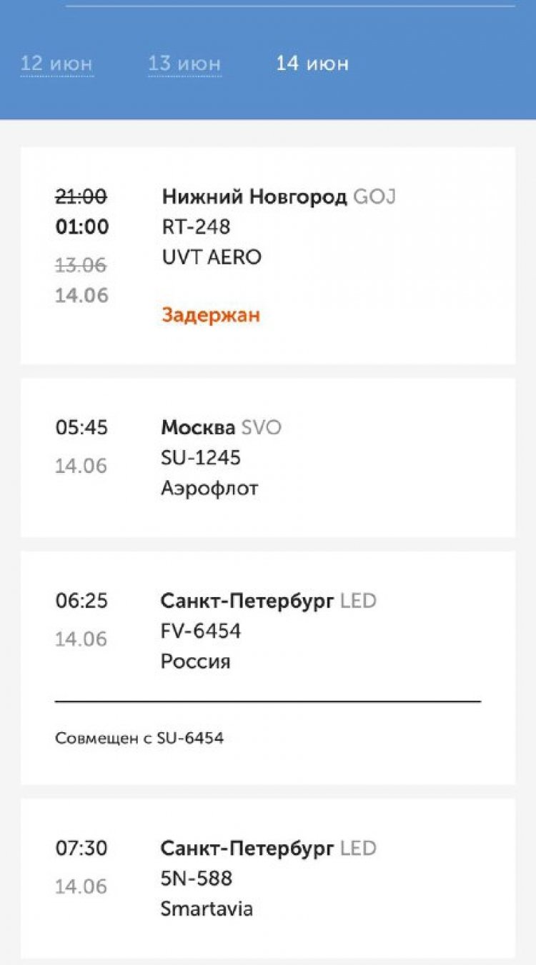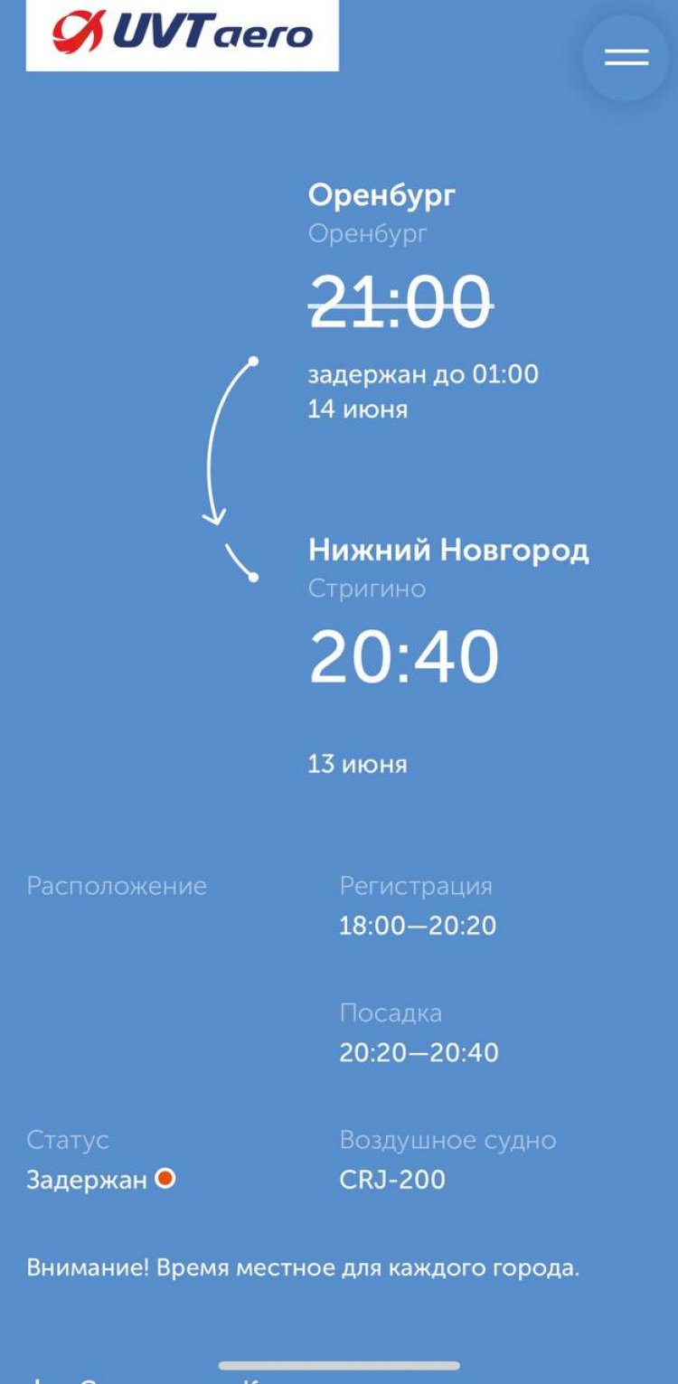 Самолёт из Оренбурга в Нижний Новгород задержали: согласно данным онлайн-табло, он должен вылететь сегодня в 21:00. Но полёт отложили на 4 часа: новое время — 01:00 14 июня. Из-за чего рейс перенесли, неизвестно.