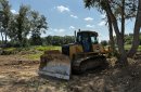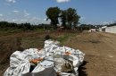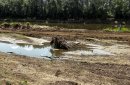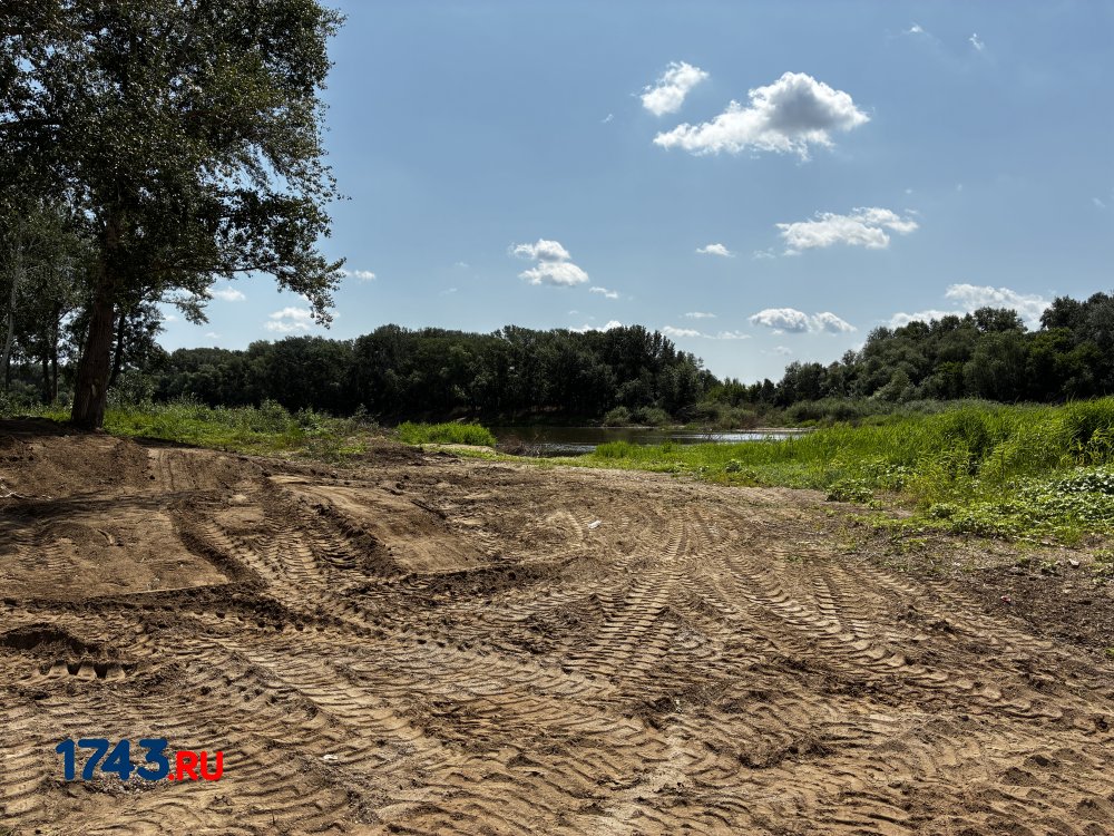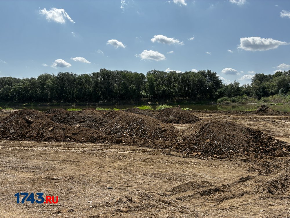 Ямы, промытые разлившимся Уралом, засыпают грунтом — его привозят на берег самосвалами. Недалеко от воды высятся кучи земли, их разравнивают тракторами.