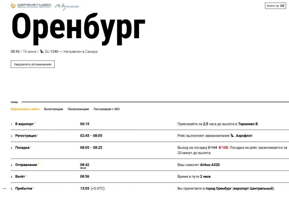 Скриншот с сайта аэропорта «Шереметьево»