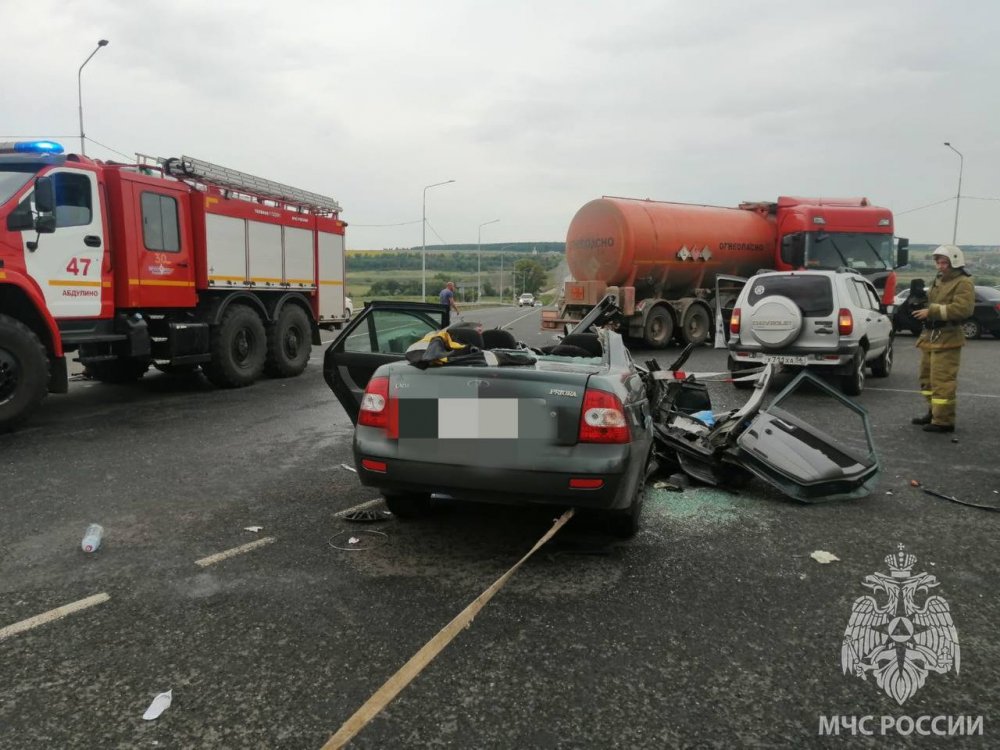 Под Абдулино столкнулись нефтевоз и легковой автомобиль. По предварительной информации ГУ МЧС России по Оренбургской области, в ДТП пострадали 2 человека. Одного из них — женщину — специалистам 47 пожарно-спасательной части пришлось деблокировать из автомобиля.