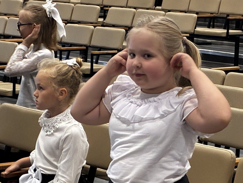 — А теперь давайте немного потанцуем. В танце у нас будут те движения, которые мы только что выучили. Вот мы подходим к перекрестку. Что нужно сделать? Правильно, остановиться и посмотреть по сторонам. Останавливаемся, смотрим налево… Направо…