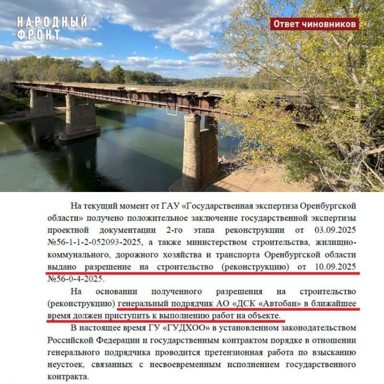 В ближайшее время в Оренбурге начнут реконструкцию старого моста через Сакмару в Оренбурге, сообщает ОНФ. Переправа разрушается — куски бетона уже падают на берег. Эксперты Народного фронта выяснили, что контракт почти на 2,7 миллиарда руб. для реконструкции моста был заключен 29 января 2024 г. По его условиям проект по демонтажу старого моста нужно было сделать до 30 сентября 2024 г., а строительно-монтажные работы – с 1 октября по 15 декабря 2024 г. Но к объекту так и не приторонулись.