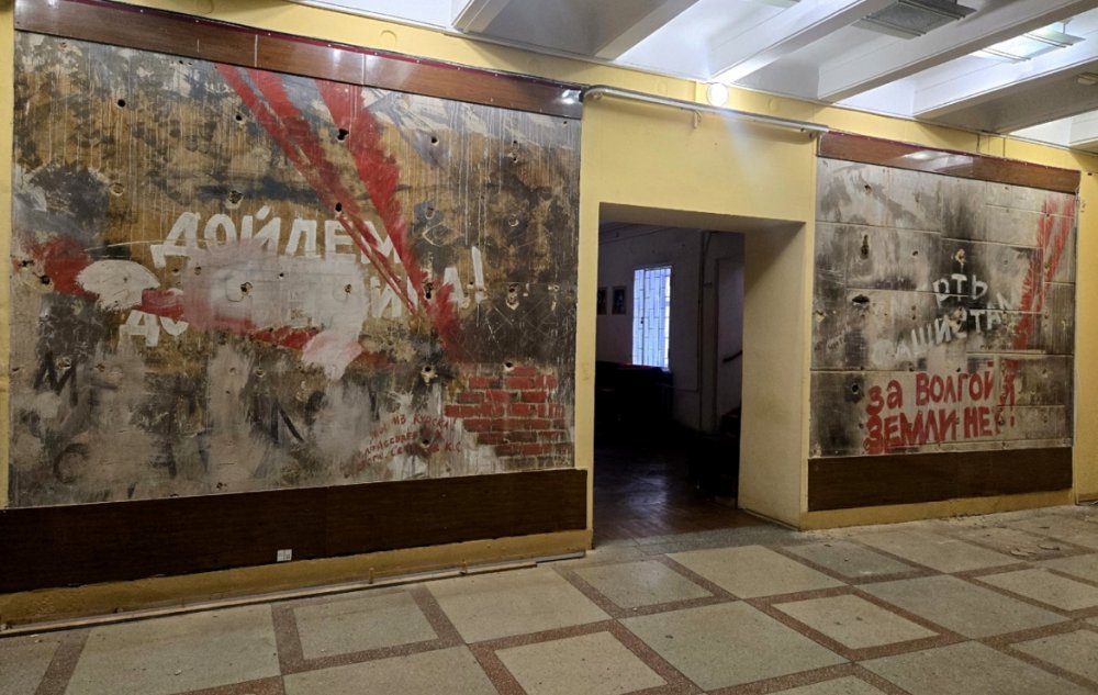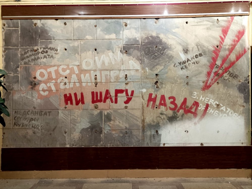 «Ни шагу назад», «На Берлин», «Отстроим Сталинград», «За Волгой земли нет», имена и фамилии людей, города, откуда, видимо, они родом: надписи чем-то напоминают те, что в 1945 году советские солдаты оставляли на Рейхстаге. Часть рисунков замазана, что делает их ещё атмосфернее.