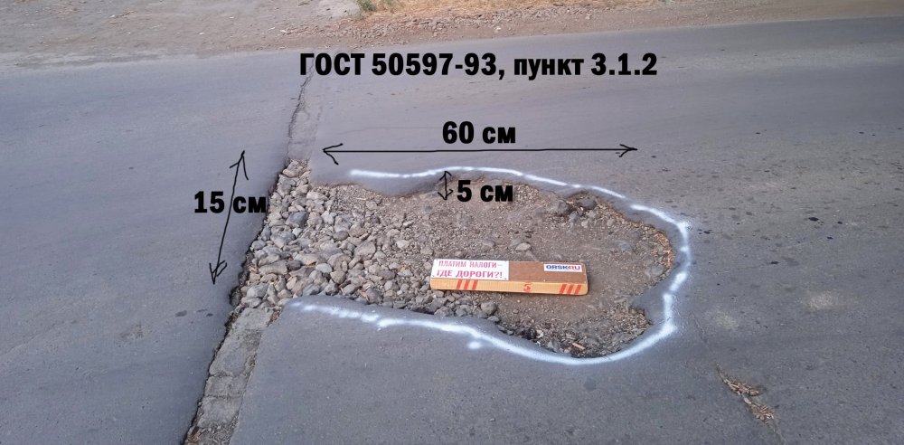 В соответствии с ныне действующим в России ГОСТом 50597-93, размеры ям не должны превышать 15 см по длине, 60 см по ширине и 5 см по глубине. Все остальное должно быть отмечено соответствующими дорожными знаками или заграждениями с сигнальными огнями.
