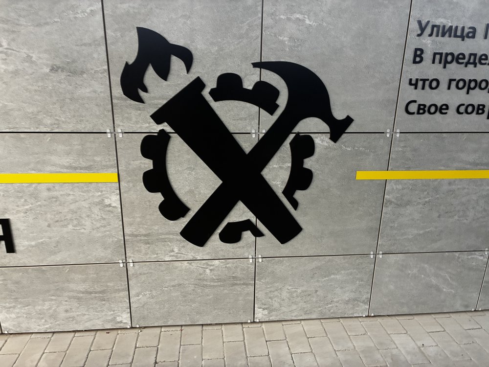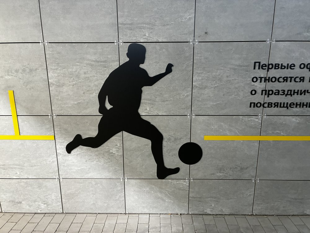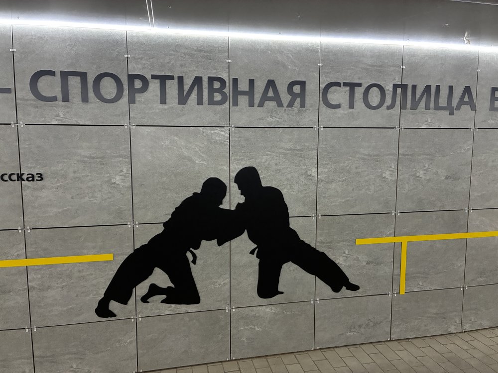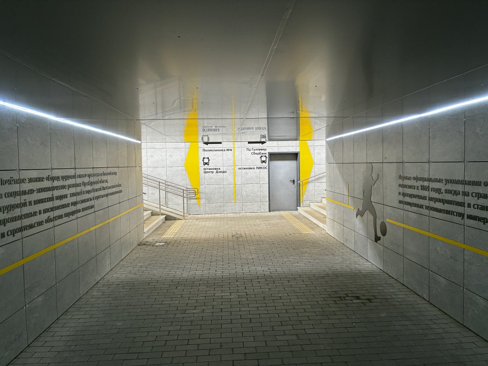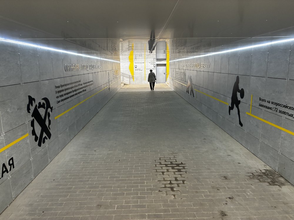 Симпатичный дизайн — не слишком пестро (серо-желтые стены с черными рисунками и надписями, как в переходе между «Восходом» и театром музкомедии), но и не уныло. Стены украшают рисунки — в данном случае, поскольку рядом расположен спорткомплекс, выбрана тема спорта. Крупным, хорошо читаемым шрифтом набраны данные об истории оренбургского спорта, схематично изображены атлеты. С другой стороны — интересные факты об истории города и региона, туристы такое любят. Если учесть, что переходом будут пользоваться и участники соревнований, и паломники, приезжающие в новый православный храм, задумка кажется удачной.
