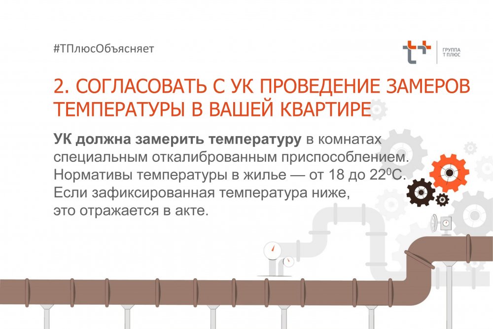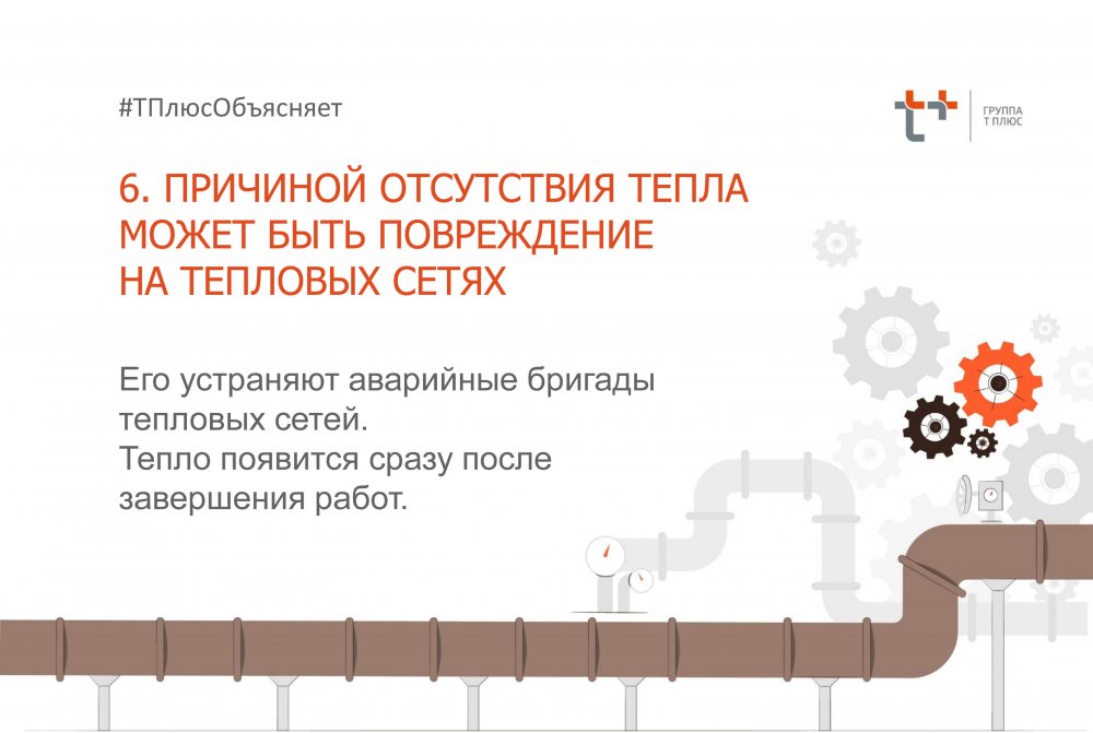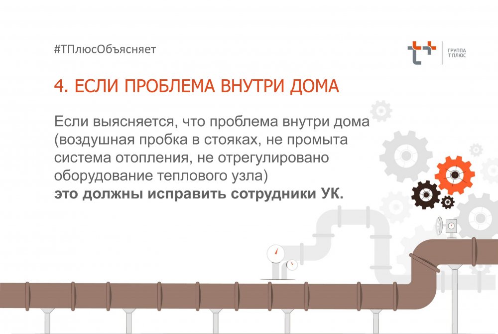 Энергетики «Т Плюс» напоминают: если управляющая компания в ответ на обращения жильцов предлагает им самим обращаться в теплоснабжающую организацию — это неправомерно. В случаях, когда для устранения проблем с отоплением необходимо участие специалистов теплосетей или тепловой инспекции, их должна пригласить жилищная организация.