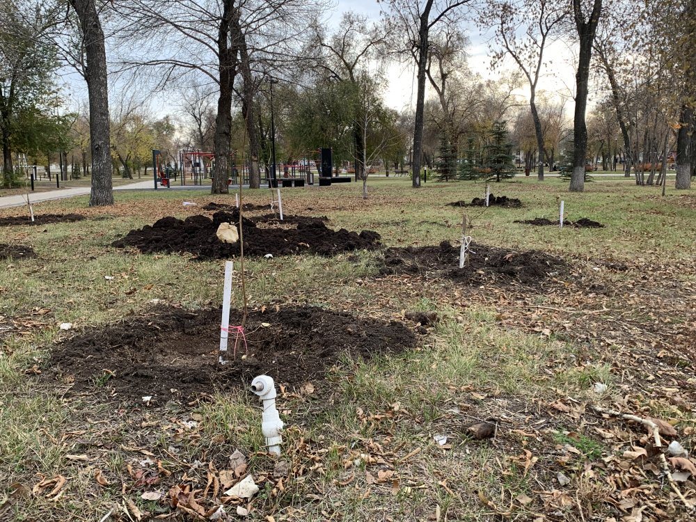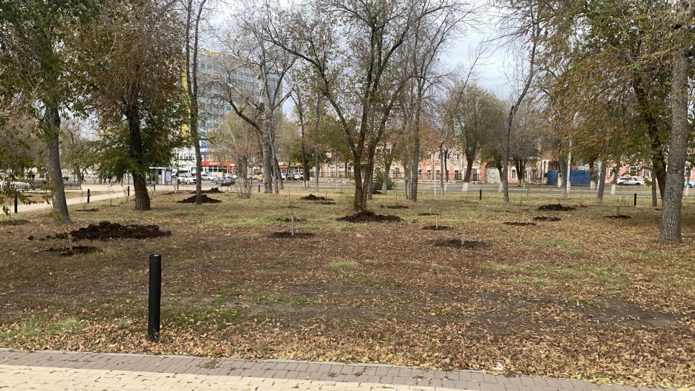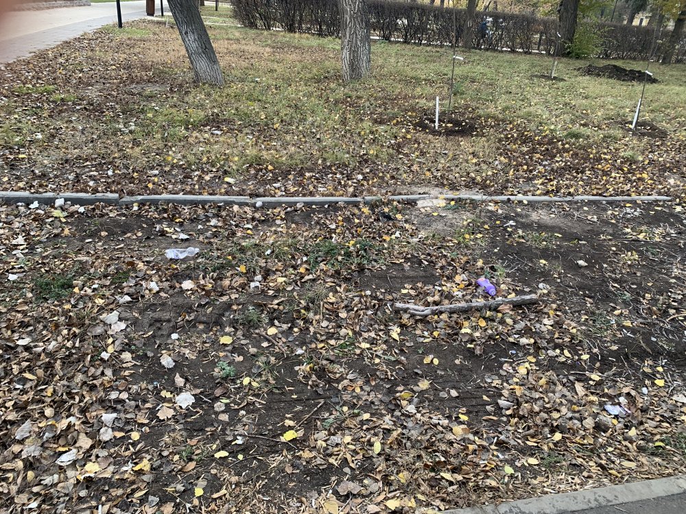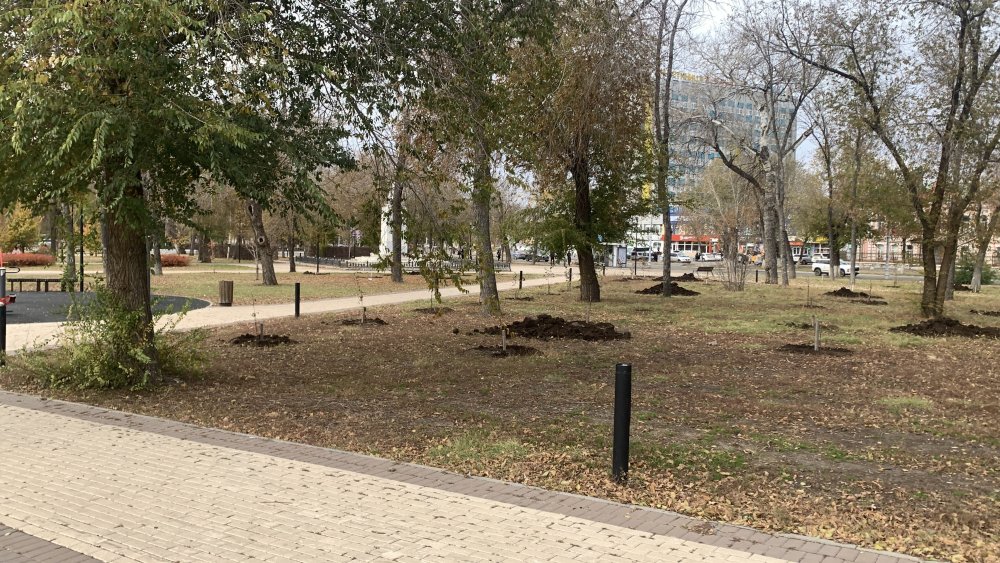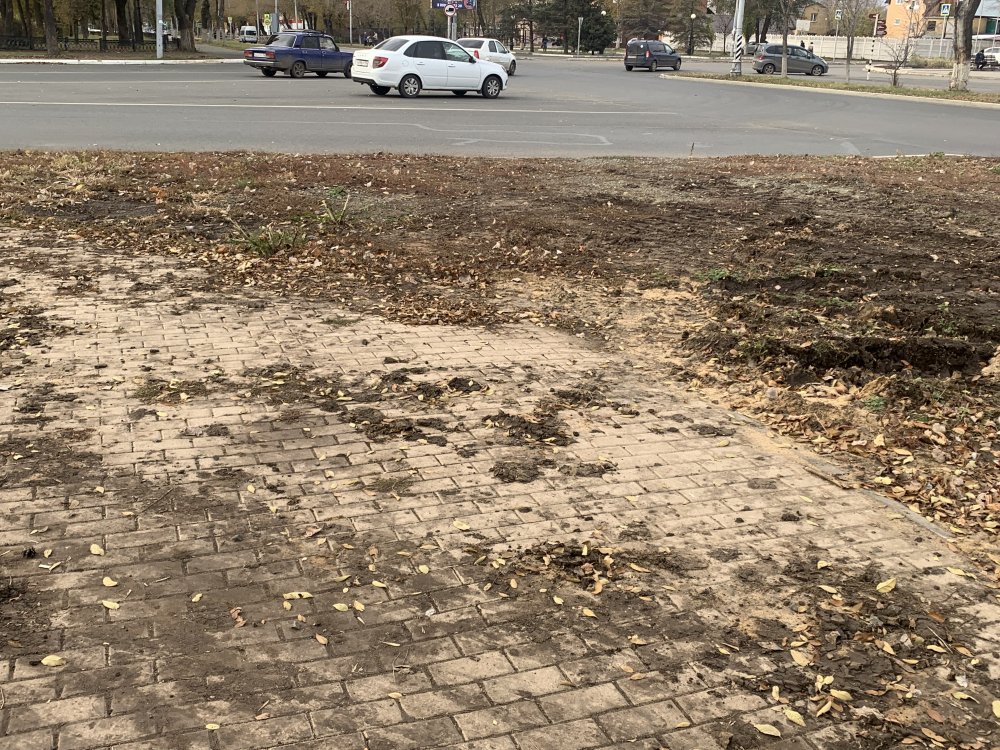 Что касается зеленых насаждений, то из катастрофически мало. Видно, что в землю навтыкали свежих саженцев (может, после августовского скандала?). Примутся они или нет, выяснится весной. А пока было бы неплохо очистить тротуарную плитку.