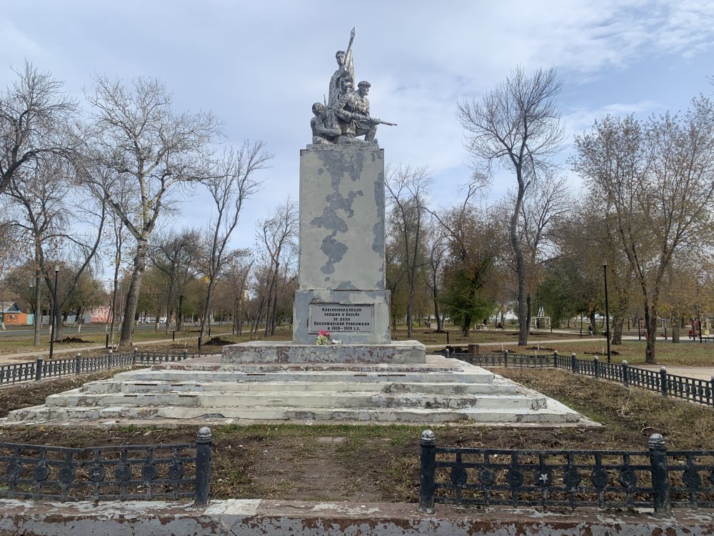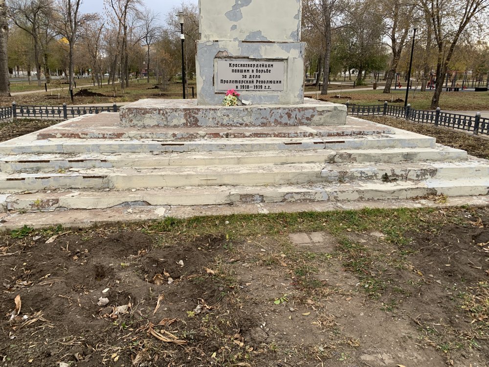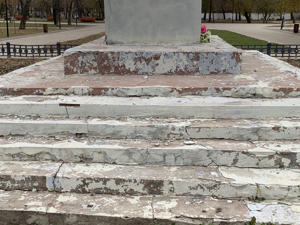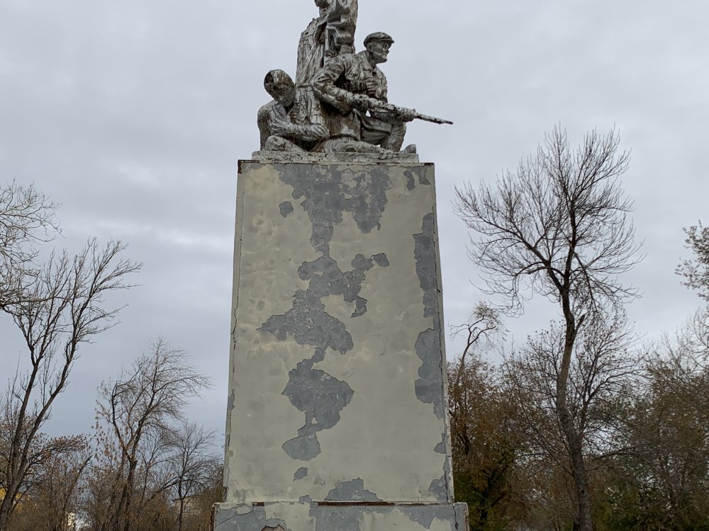 Ну и, конечно, памятник красногвардейцам. Это не просто скульптура — в годы Гражданской войны на месте нынешнего парка Ленина располагался «революционный некрополь», где хоронили погибших бойцов красных частей, и в 1931 году на месте братской могилы воздвигли этот памятник — не типовой, по стандартным отливкам, а уникальный, изготовленный скульпторами Герцог и Крестьянсон. И вот теперь он, являющийся центральным элементом парка, выглядит просто чудовищно.