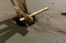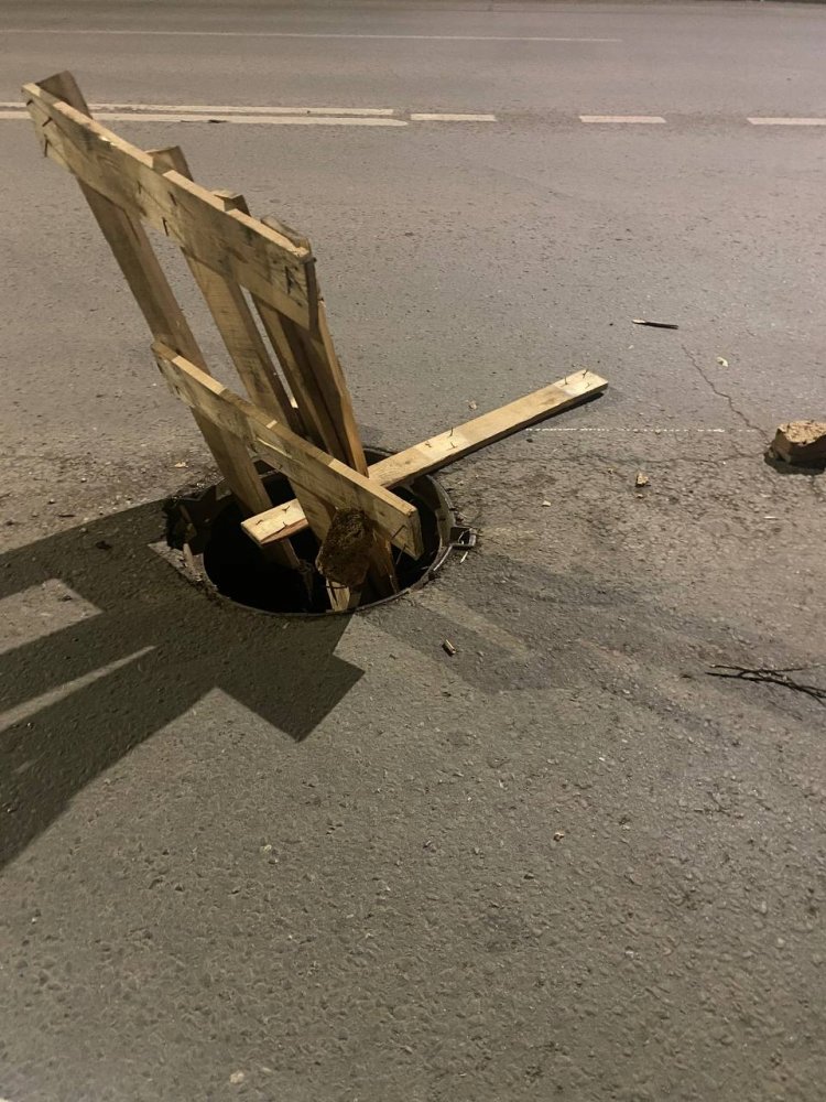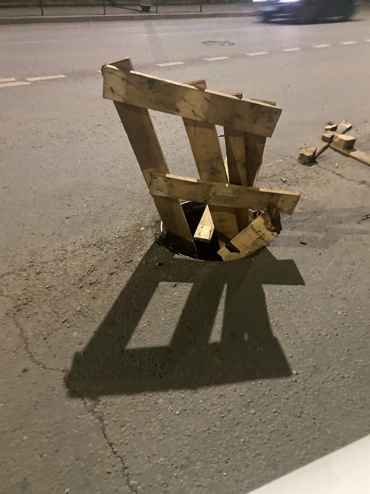 Кто-то попытался сделать опасную яму заметной и воткнул в неё доски. Но всё-таки хочется, чтобы вернули просто крышку от люка.