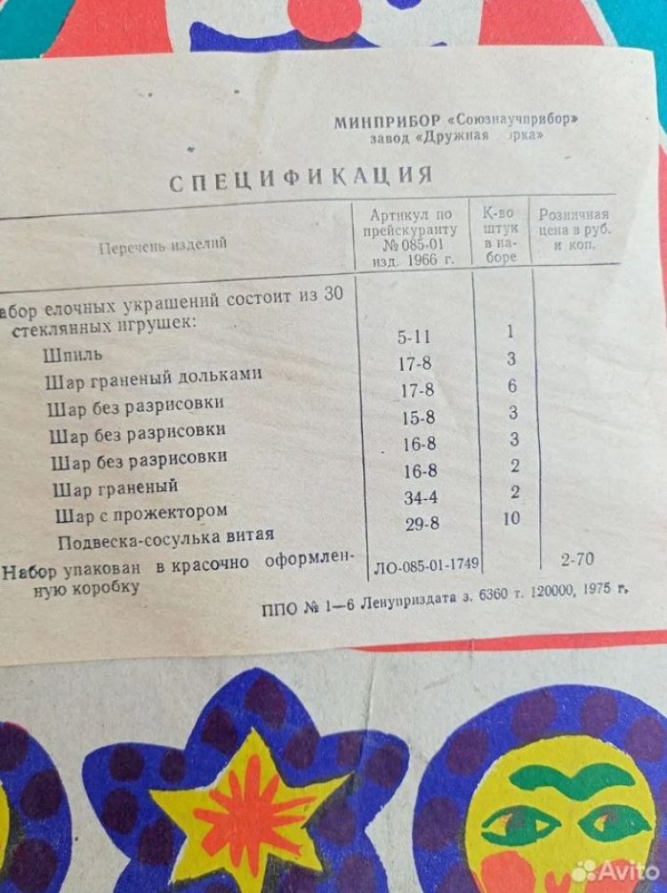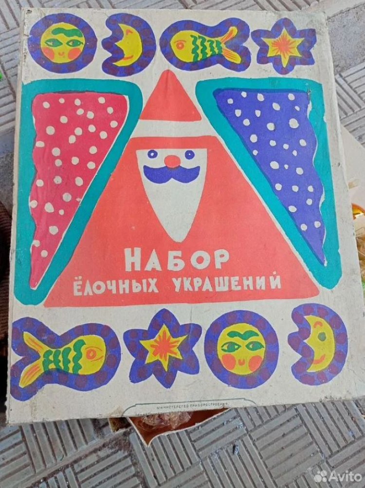 Или вот — набор игрушек от ленинградского завода «Веселая горка», входившего в трест «Союзнаучприбор». Казалось бы, где научные приборы, а где — стеклянные шарики с сосульками? Но своя логика и в этом была. Итак, заглянем внутрь.