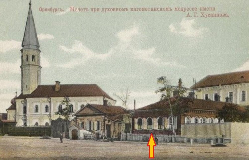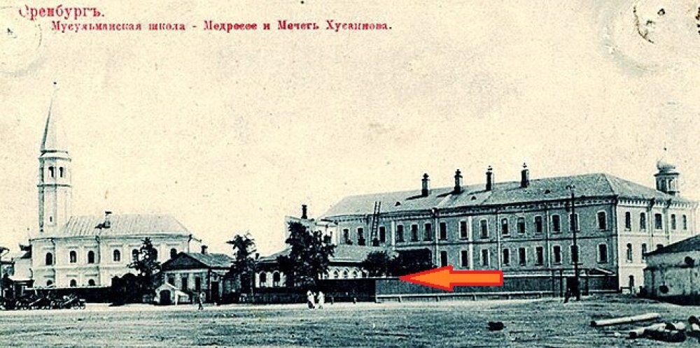 Землю на самой окраине Оренбургской крепости, у городского вала (который проходил по территории нынешней гимназии) купец Ахмед Хусаинов купил в 1890 году. Там он начал строить красивейшую мечеть и трехэтажное задние медресе, то есть духовного училища. Но занятия начались еще до начала строительства, в 1889 году, и проводились они в одноэтажном доме, возведенном десятью годами ранее. Вот он на старых фото.