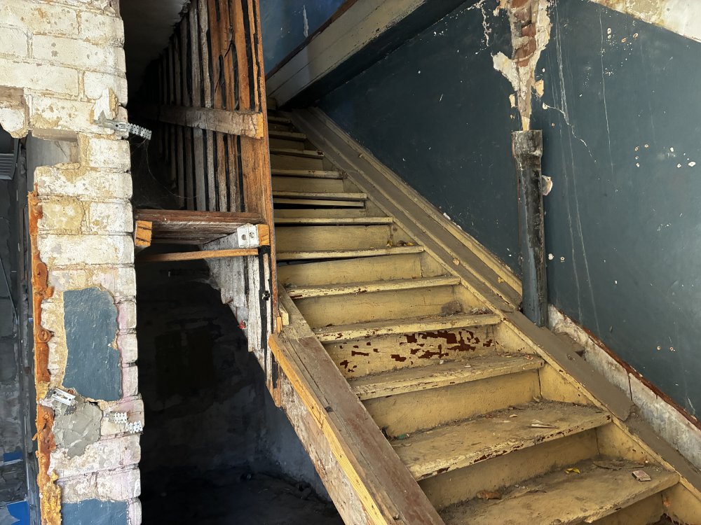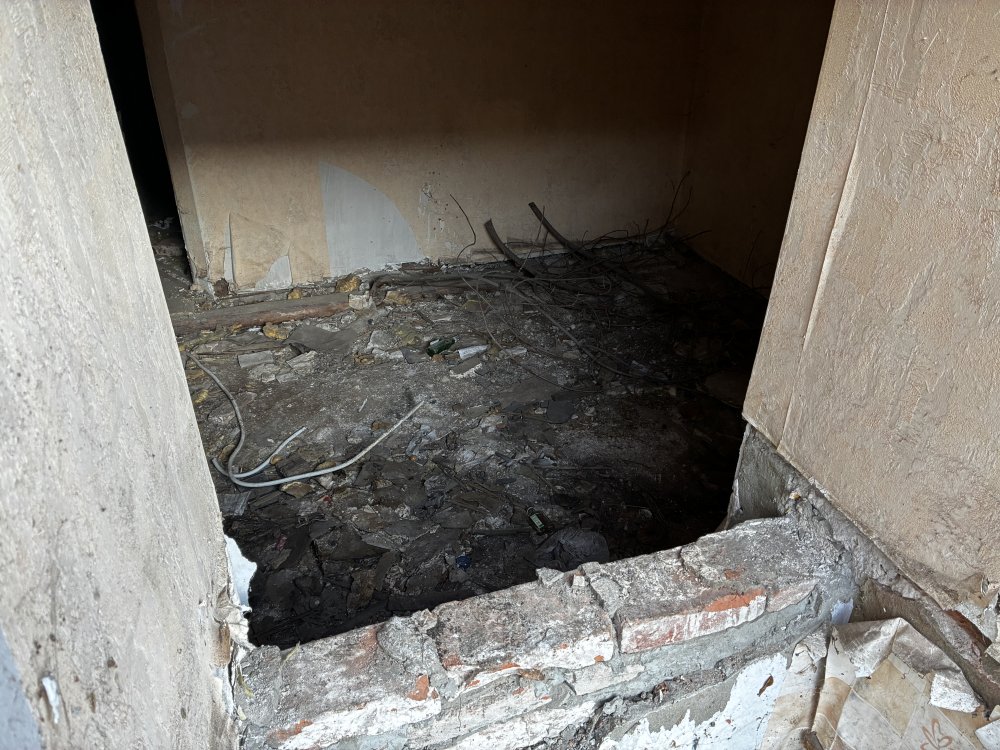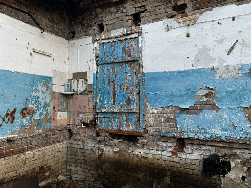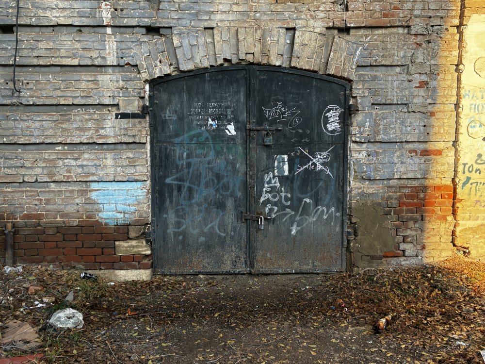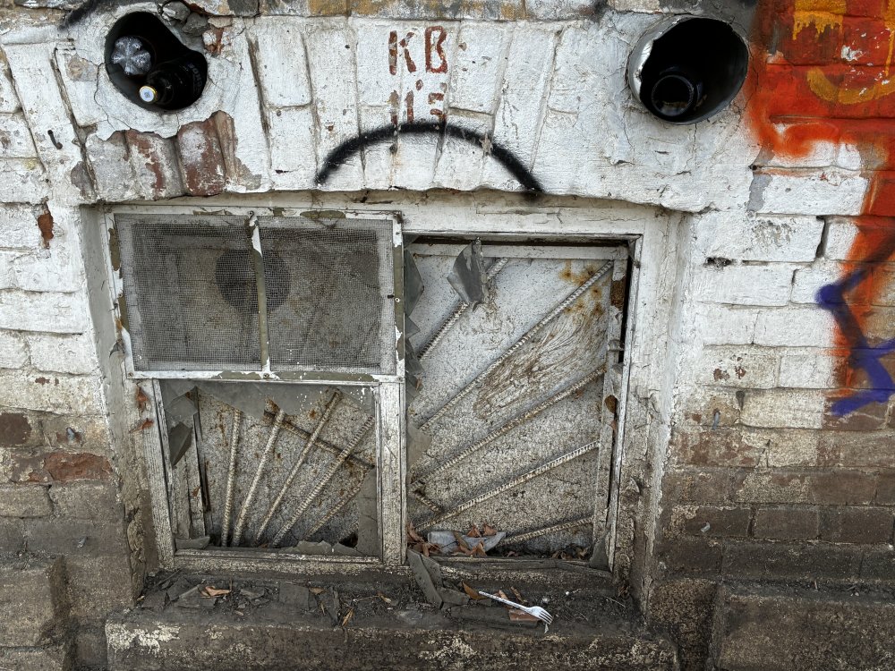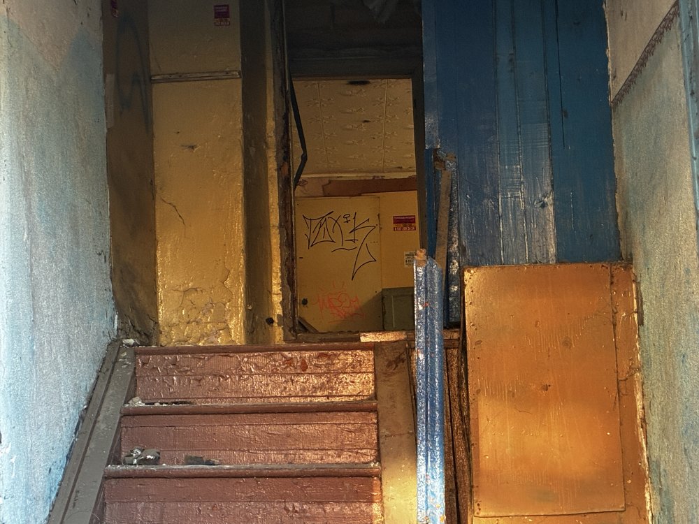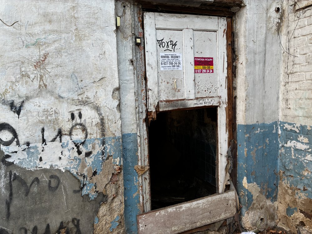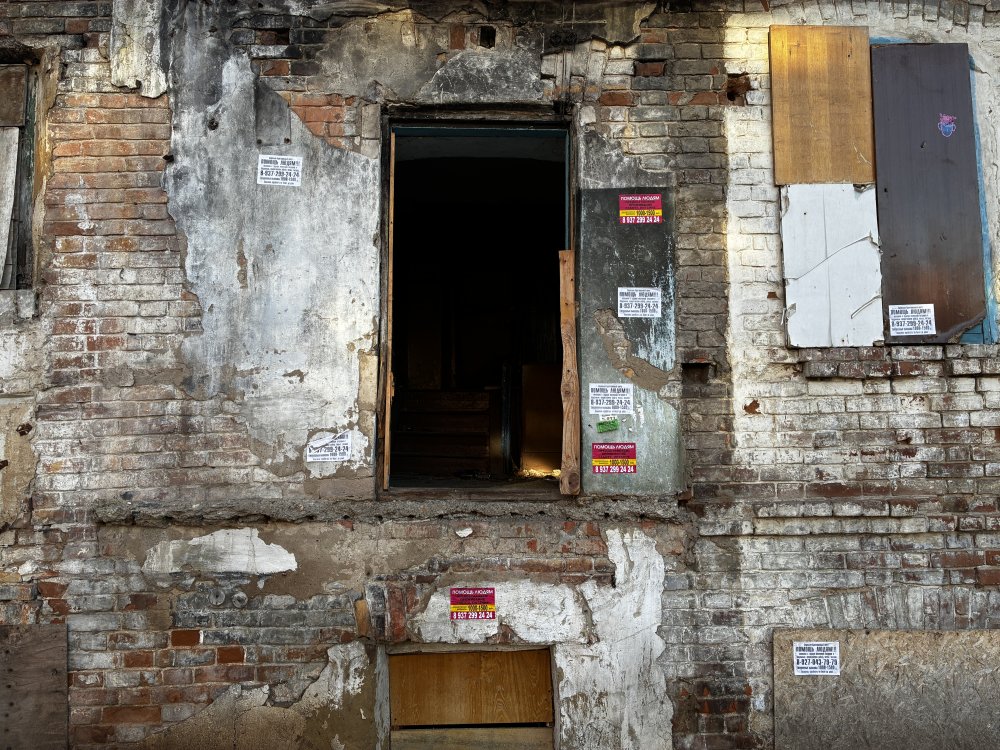 Некоторые доски оторваны, и через дыры видно, что внутри все засыпано разнообразным хламом, завалено бутылками, а еще из темноты сильно несет общественным туалетом: как говорят местные жители (вокруг, в таких же старых домах, еще живут люди), внутри обитают бездомные, время от времени они устраивают там шумные попойки и жгут костры.
