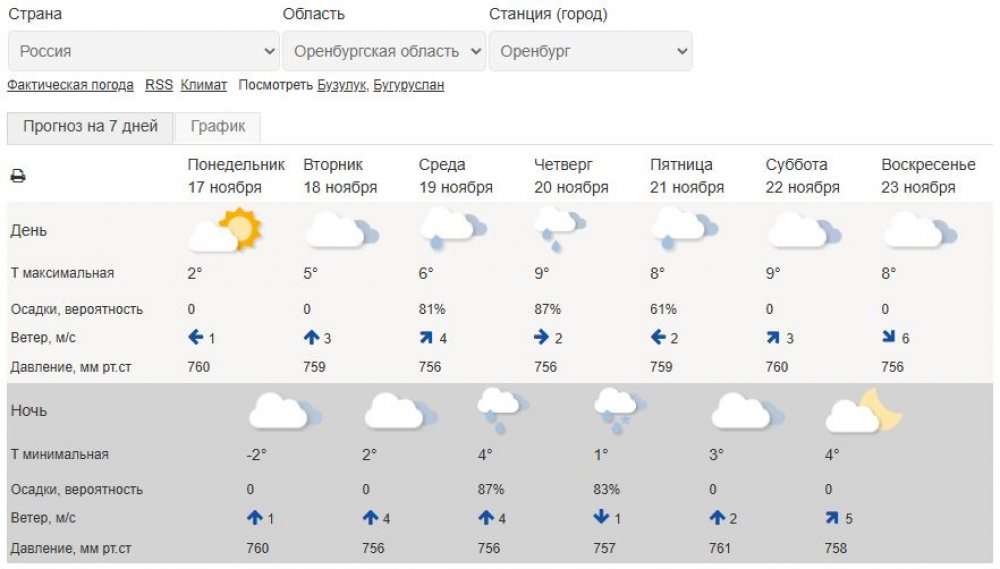 — Сухая погода в Оренбуржье задержится только в первые дни рабочей недели, а затем поля фронтальной облачности принесут дожди, в северных районах переходящие в снег.  Южные воздушные потоки будут поддерживать температурный фон выше климатичевской нормы. В середине периода, находясь в зоне атмосферного фронта, в большинстве районов пройдут осадки, преимущественно в виде дождя, различной интенсивности, усилится ветер до порывистого, температурный фон существенно не изменится.