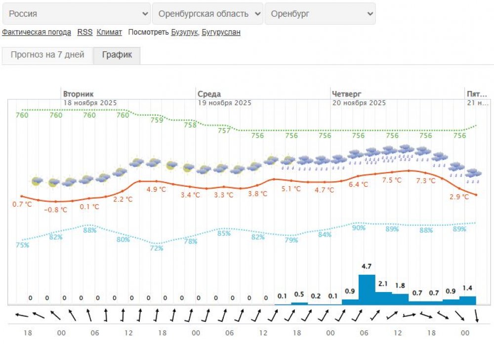 Судя по графику Росгидрометцентра, в четверг на Оренбург обрушится настоящий ливень при температуре воздуха 5-8 градусов.