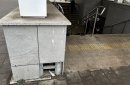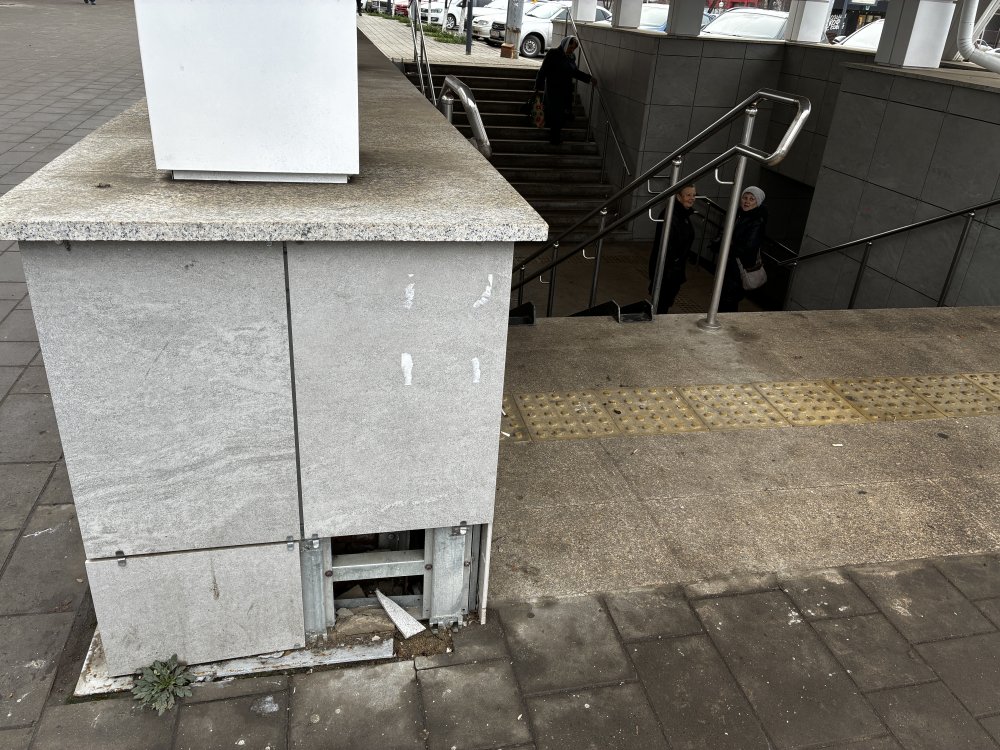 Кстати, на улице, у входа под землю, плитка тоже разбита. И это уже не похоже на акт вандализма: кажется, здесь кто-то пытался сбить грязь с обуви или зацепил плитку чем-то вроде коляски.