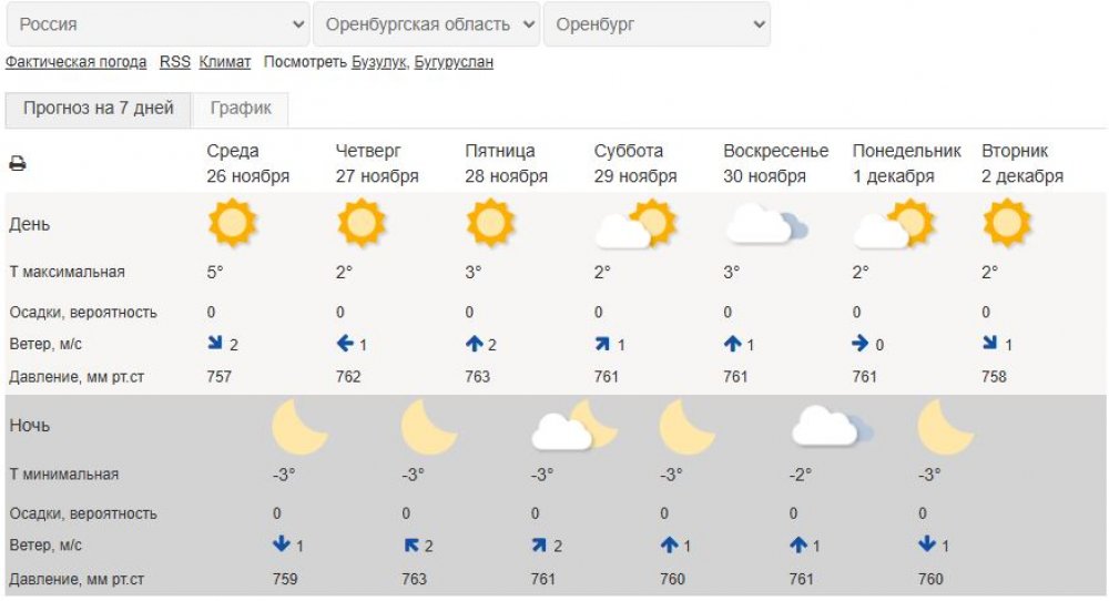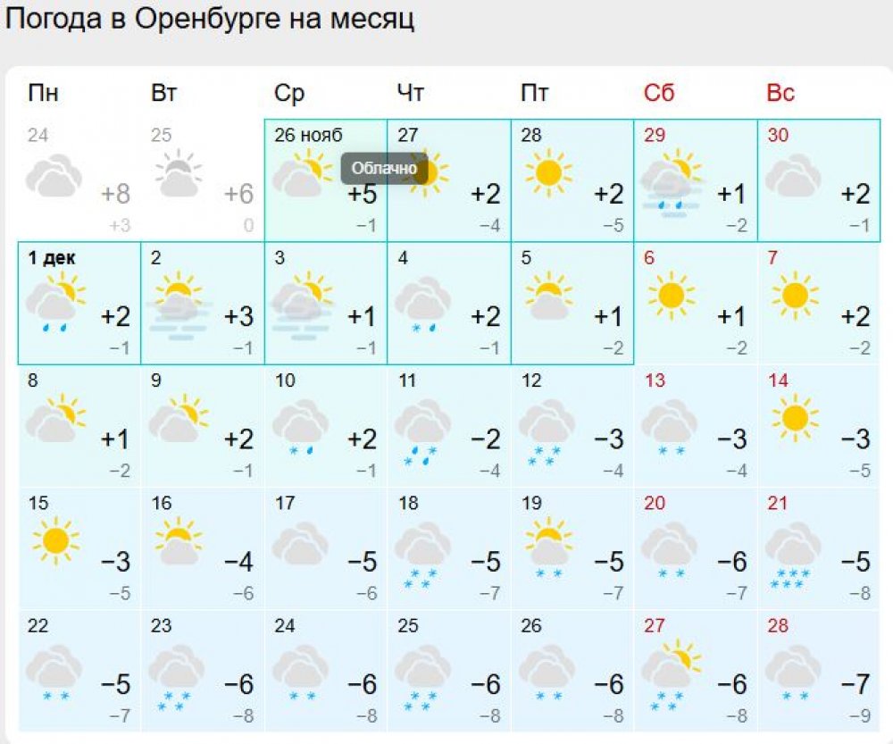 Прогноз, сделанный синоптиками Росгидромета, неутешителен: в течение ближайшей недели ждать похолодания и выпадения снега не стоит. Днем будет стоять плюсовая температура от +2 до +5 градусов, по ночам столбик термометра станет отпускаться до -2, иногда -3 градусов. Но вероятность осадков нулевая: снега в ближайшую неделю точно ждать не стоит. В декабрь Оренбург войдет без снежинки.