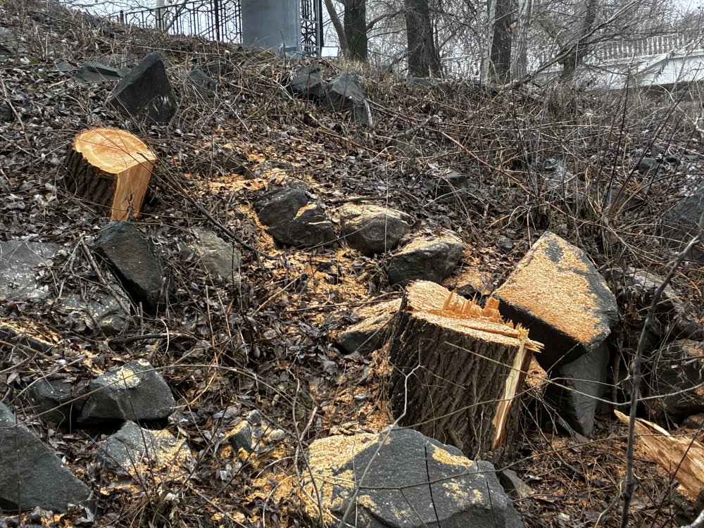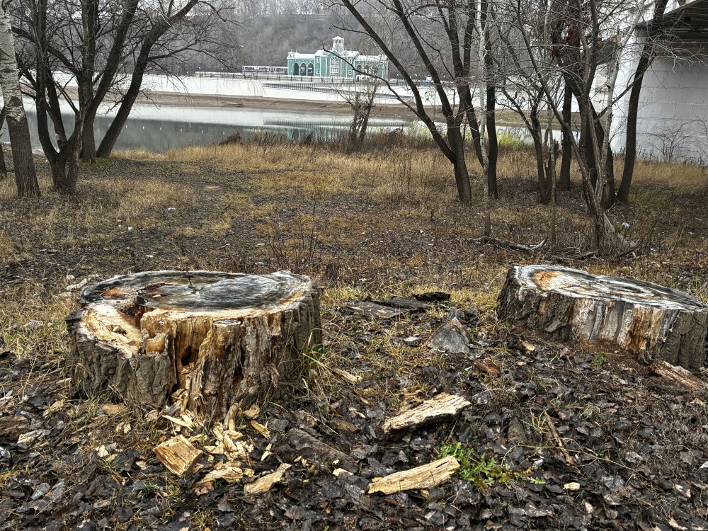 Действительно, деревья, по крайней мере те, что стоят у пешеходного моста, выглядят ужасно: старые, больные. От некоторых отламываются гигантские ветки, да и пеньки встречаются то и дело: чтобы подгнившее дерево не рухнуло на человека, его спиливают… И создается ощущение, что спиленных деревьев здесь больше, чем живых.