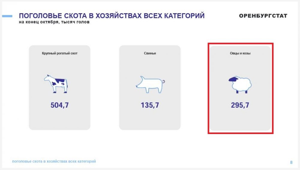 На конец октября 2025 года в Оренбуржье имеется 295,7 тысяч голов мелкого рогатого скота. При этом в октябре 2024 их было 299,7 тысяч, а в октябре 2023 — 294,5 тысяч.