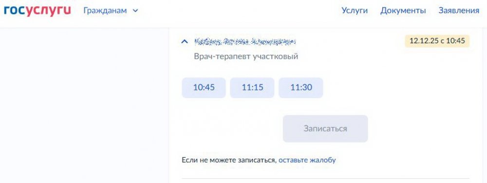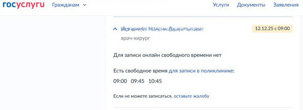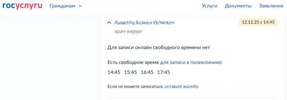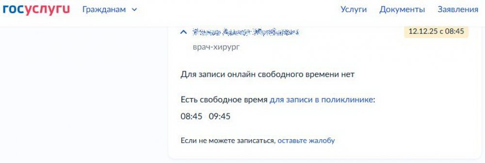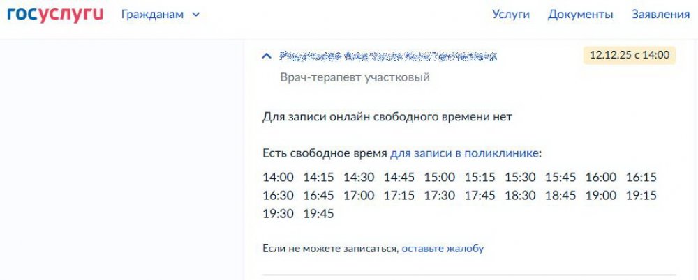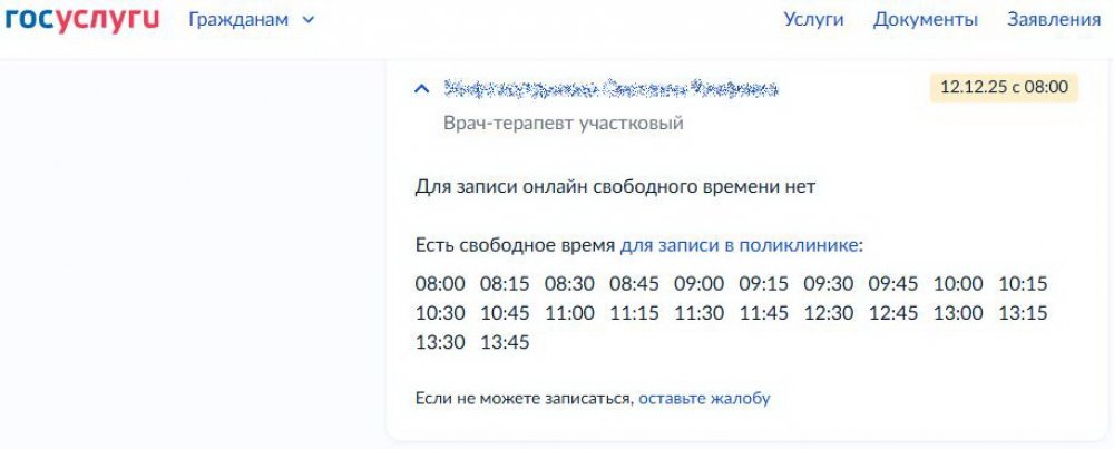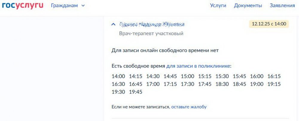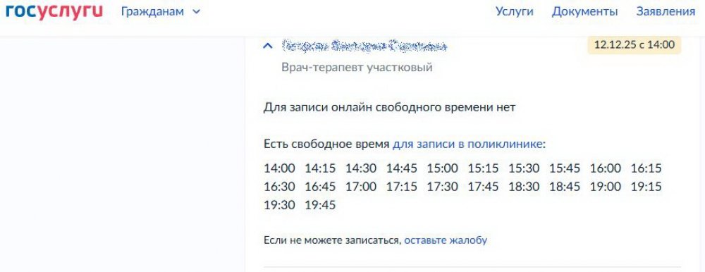 Начинаем с начала: терапевт. Для чистоты эксперимента выбираем день 12 декабря: ровно через неделю (понятно, что на сегодня-завтра попасть гораздо труднее, а неделя – приличный срок)… Итак, терапевт. Свободных окошек — 22 штуки! Но есть нюанс: это «свободное время для записи в поликлинике». Через интернет почему-то попасть на прием в этот день нельзя: «для записи онлайн свободного времени нет». Смотрим второго, третьего, четвертого врача с других участков — та же история. К пятому можно записаться и через интернет — есть три окошка.