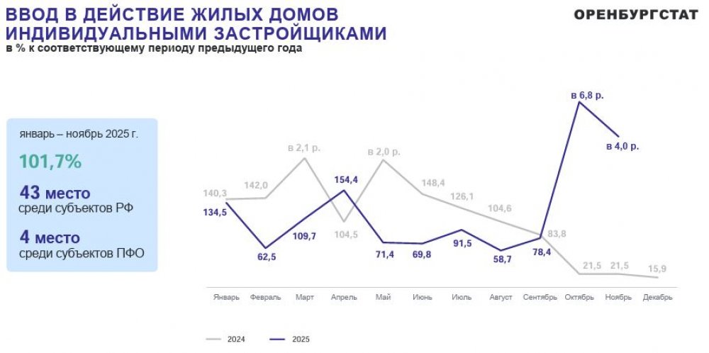 Самые мощные темпы строительства — на востоке области. Орск почти в два раза увеличил темпы строительства: 182% по сравнению с аналогичным периодом 2024 года. Это абсолютно закономерно: город сильно пострадал от паводка 2024 года, люди получили компенсации и взялись возводить новые дома.