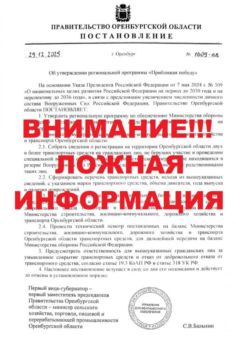 В сети распространяется информация о том, что якобы в Оренбургской области утвердили программу «Приближая победу», согласно которой местные жители добровольно должны передать личные автомобили в распоряжение Минобороны. В правительстве Оренбуржья предупредили: это фейк! Такого документа нет, как и программы!