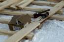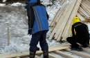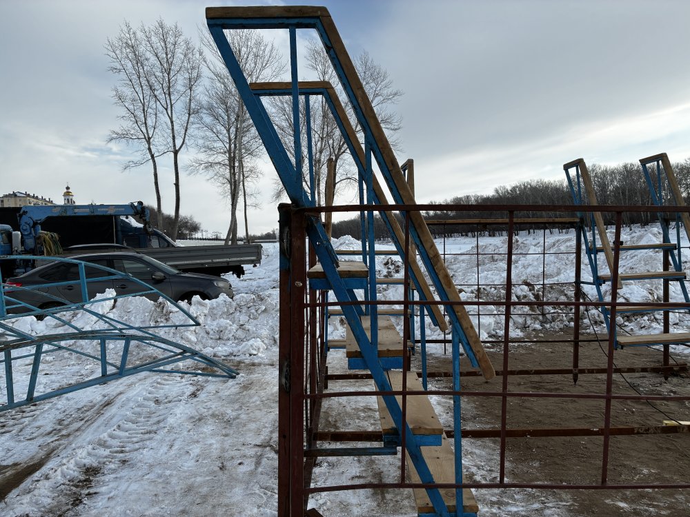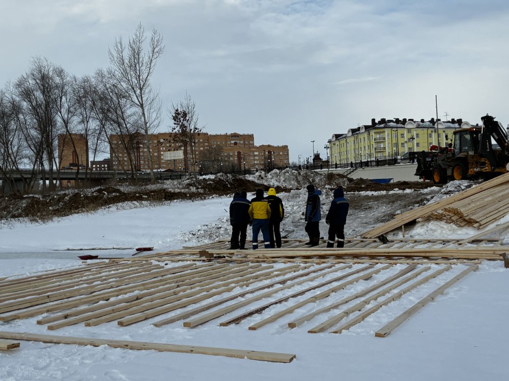 Сейчас рабочие собирают настил из длинных досок — они не позволят льду проломиться, даже если на него взойдет сразу много человек (впрочем, он достаточно крепкий: по сведениям департамента ПБ и ГЗ Оренбургской области, безопасным для организации пешеходной переправы через реку считается 15-сантиметровый лед, а на Урале сейчас толщина льда составляет 30 сантиметров), и, кроме того, купающиеся не будут пристывать ко льду босыми ногами.