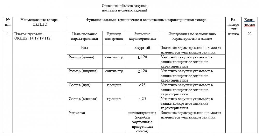 Судя по техзаданию, администрация планирует купить 20 пуховых платков. Они должны быть квадратными, каждая сторона – не менее метра 20 сантиметров. Состав платка — на 75% (можно и больше) пуха, остальное — вискоза.